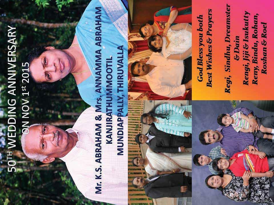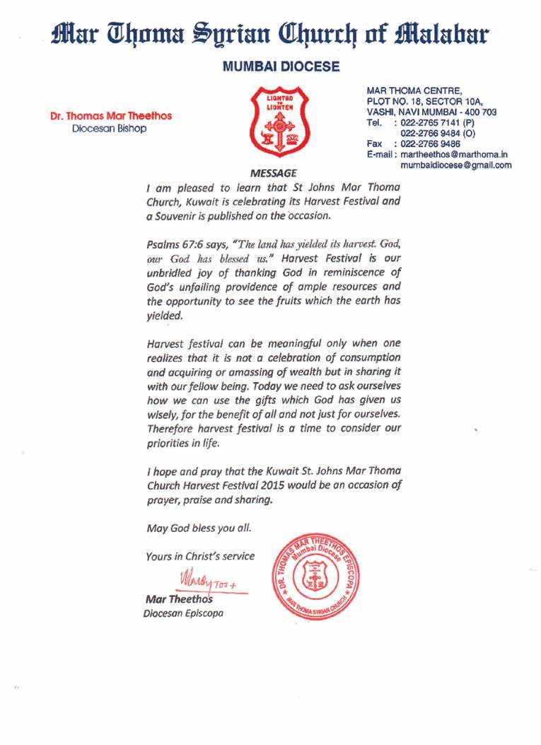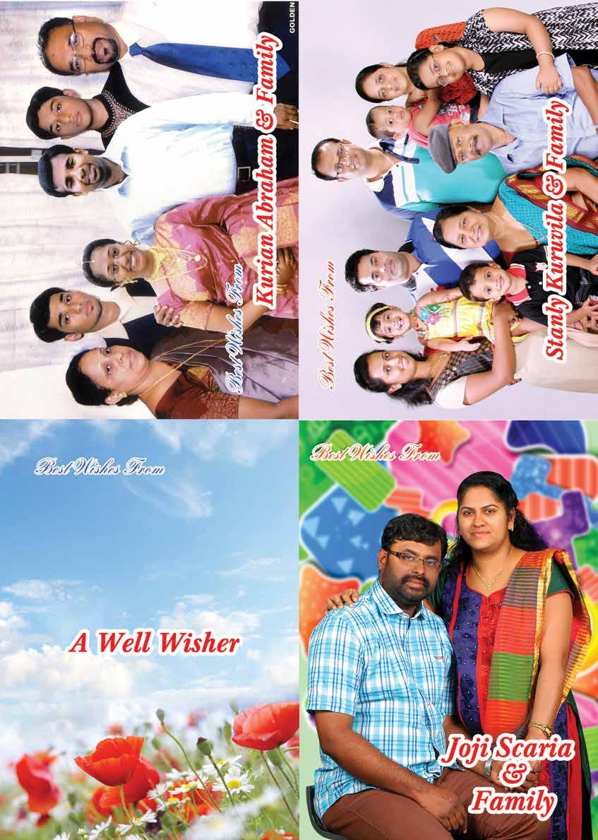 I convey my deepest appreciation and gratitude to our Achen Rev. Sunil. A. John, Par ish Secretary Byju Jose, Joint Convener K.M Mathew, fellow committee members, parish members who brought in advertisements and family photos, those who contributed articles, designer Mr. Jinu, office bearers, harvest committee members etc.