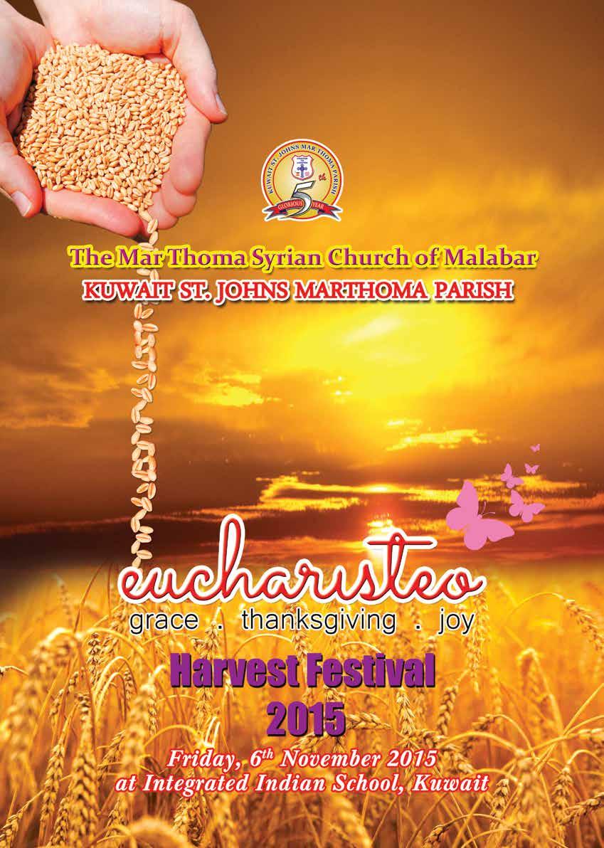 During our initial discussions, our Vicar Rev. Sunil A. John proposed this year’s Harvest Festival to be titled “Eucharisteo”, which means ‘to express gratitude’. Having passed 5 glorious years as St. John’s Marthoma Parish, there are plenty of reasons to express our gratitude to our God for sustaining us thus far from the very humble beginnings. Being the Souvenir Convener took me to the ‘behind the scenes’ realm of transforming a Souvenir from a decision taken at a Committee meeting to a tangible book which you are holding and hopefully appreciating. The greatest lesson I have learned through this experi ence is how important God’s grace and support from our Parish members is to make this a reality.