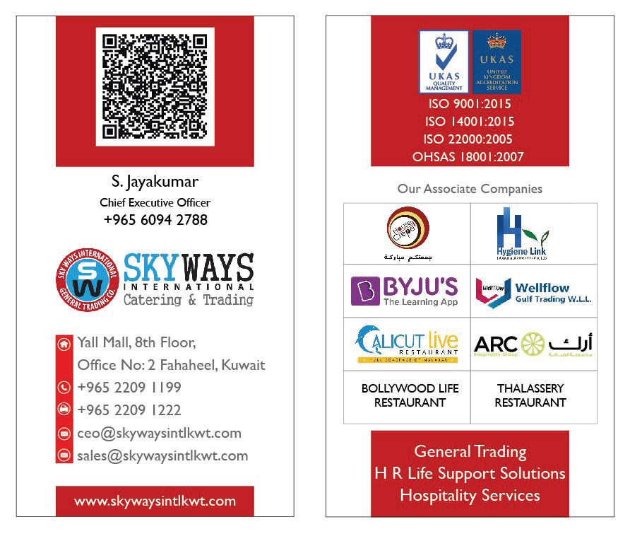 Head Office : Yaal Mall, 8th Floor, Office No. : 2, Fahaheel, Kuwait. E-mail : skywaysq8@gmail.com - sales@skywaysintlkwt.com GROUP INTERNATIONAL General Trading & Contracting Company Our Group Companies : CALICUT LIVE RESTAURANT Salmiya AL RAHMANIYA Catering LLC THALASSERY RESTAURANT Mangaf HYGIENE LINK General Trading WLL BOLYWOOD LIFE Ajial Mall Fahaheel (Opening Shortly) Fahaheel MusicClasses MusicClasses Classes contact 95560540 INDO-ARAB MUSICAL ACADEMY KUWAIT AUDITORIUM Mangaf - Mahboula-Kuwait Tel: 95560540/99945755