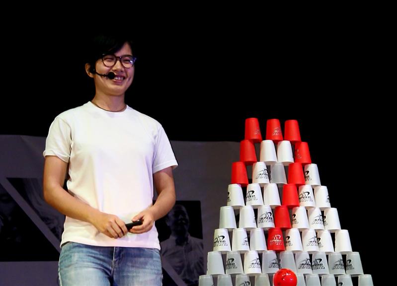 林孟欣在现场用红杯和白杯叠 起了一个红色的7字,表示幸运。 而她 又把当初陈星合赠送林的小红球,放在 了红色7字的下方,变成了一个问号。 她说,这个问号是在询问每个人心中的 梦想是什么。如今19岁的她于今年已孤 身环游世界,游历了10个国家、17个 城市,途中经历了不少突发事件,甚至 东西被窃。就算她环游世界一半的时间 都在哭,但她依然想把叠杯的力量带给 世界的每一个角落。她表示,世界上没 有任何事物可以阻止自己。