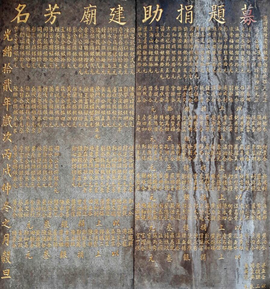 2. 3.伯公庙《募题捐助建庙芳名碑》立于光绪拾 贰年(1886),以匡理黄陈庆为首,捐银四 百陆拾伍大元。