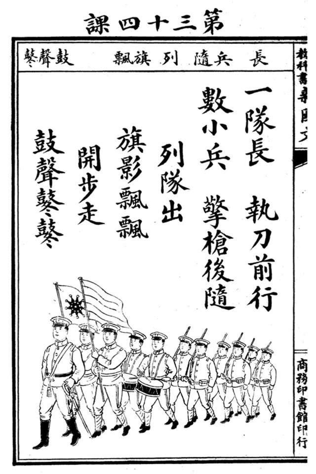 此时的小学课程,已取消了清末的 读经和讲经课。国文课占了最大的 比例,课文具有强烈的党国意识, 如:“国旗飘飘,党旗飘飘,今天开 学了,我上学去。”,又如右图。