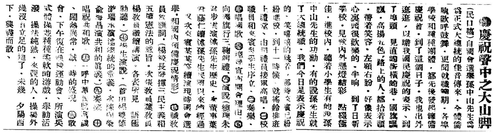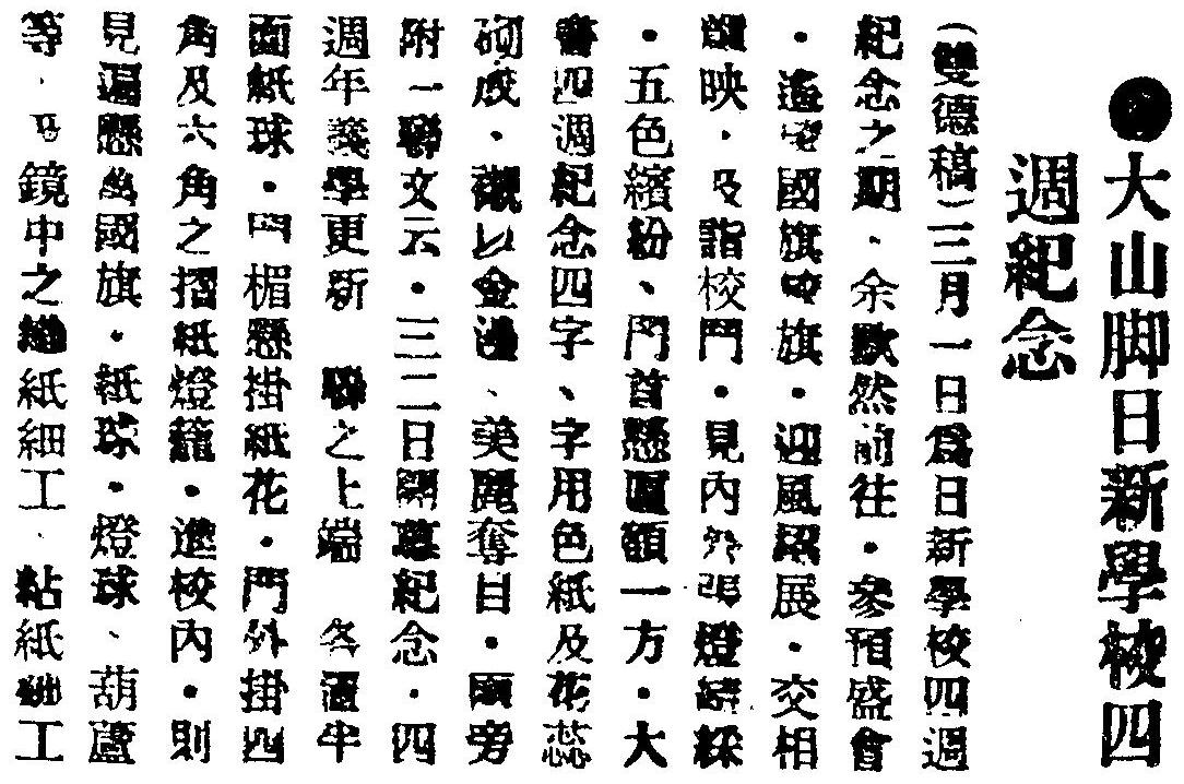日新学校曾于1921年5月初举办祝贺孙中山上任大总统的 庆典活动,以及1922年3月1日庆祝办学四周年纪念。虽目 前仅有两则剪报留存,实可提供学校早期活动的讯息: