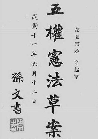 孙中山所起草的五权宪法草 案及三民主义。三民主义意 指民生、民权、民族。图中 孙文即孙中山。