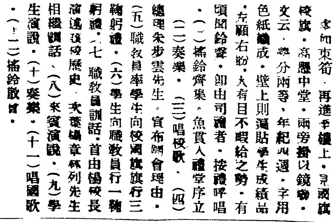 另外,值得一提的是,在1921年孙中 山庆典活动中,来宾只唱国歌;1922 年的四周年纪念活动流程表则出现唱 校歌环节,可见本校此年已有自己的 校歌,只可惜未能流传。