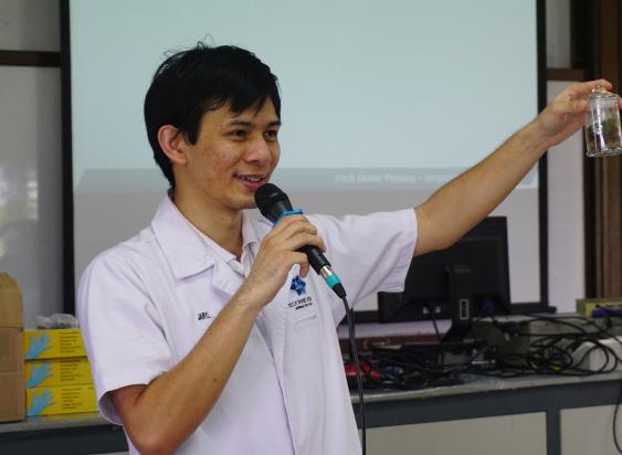 Tech Dome Penang科学教育主管,Jaryl为学生们准备了泥土、 小石子、苔藓、刷子等器材。工作人员也为每一位学生派发一 个玻璃容器及营养肥料。首先,将小石子放入玻璃容器。小石子 之间的空隙较大,因此可作排水层。接下来,在小石子上放枯萎 的苔藓,并用木材轻轻抚平,以便过滤植物体内的杂质。过后, 为提供营养于植物,我们在玻璃容器中加入泥土及营养肥料。最 后,再放入苔藓,一个美丽的生态世界便制作完成。此外,老师 也建议学生在玻璃容器中加入珠子或是小石子进行点缀,让瓶中 生态世界更加美观。