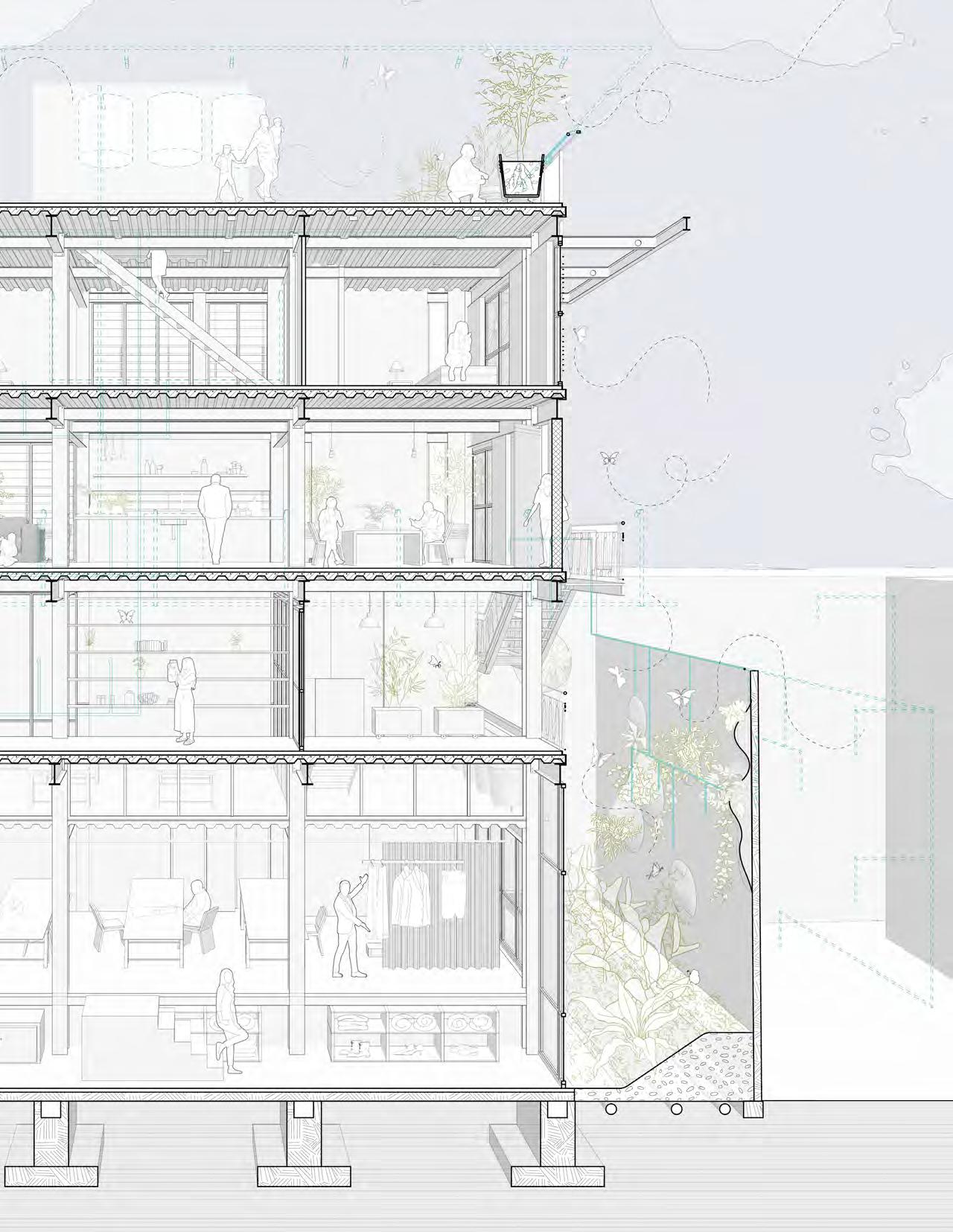 This project aims to represent perspective section drawing of Husos Architect’s Host and Nectar garden building located in Cali, Colombia. Drawing explores the immaterial aspects that are intrinsic and fundamental elements incorporated with biologists, gardeners, the community, and the local zoo. Drawing shows how human and nature co-exists, and interact in a building.