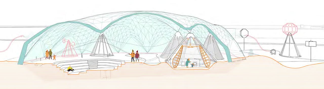 This project aims to preserve the endangered Indigenous languages and cultures in Chukotsky, the Russian Arctic area, by providing recording, editing, and archiving studios that will be available for daily use by local people. The project has a permanent basement landscape with temporary elements that travel across four villages in Chukotsky. The entire program functions as an annual cycle, including an inflatable performance center, portable unit, and snow dome that change with the seasons.