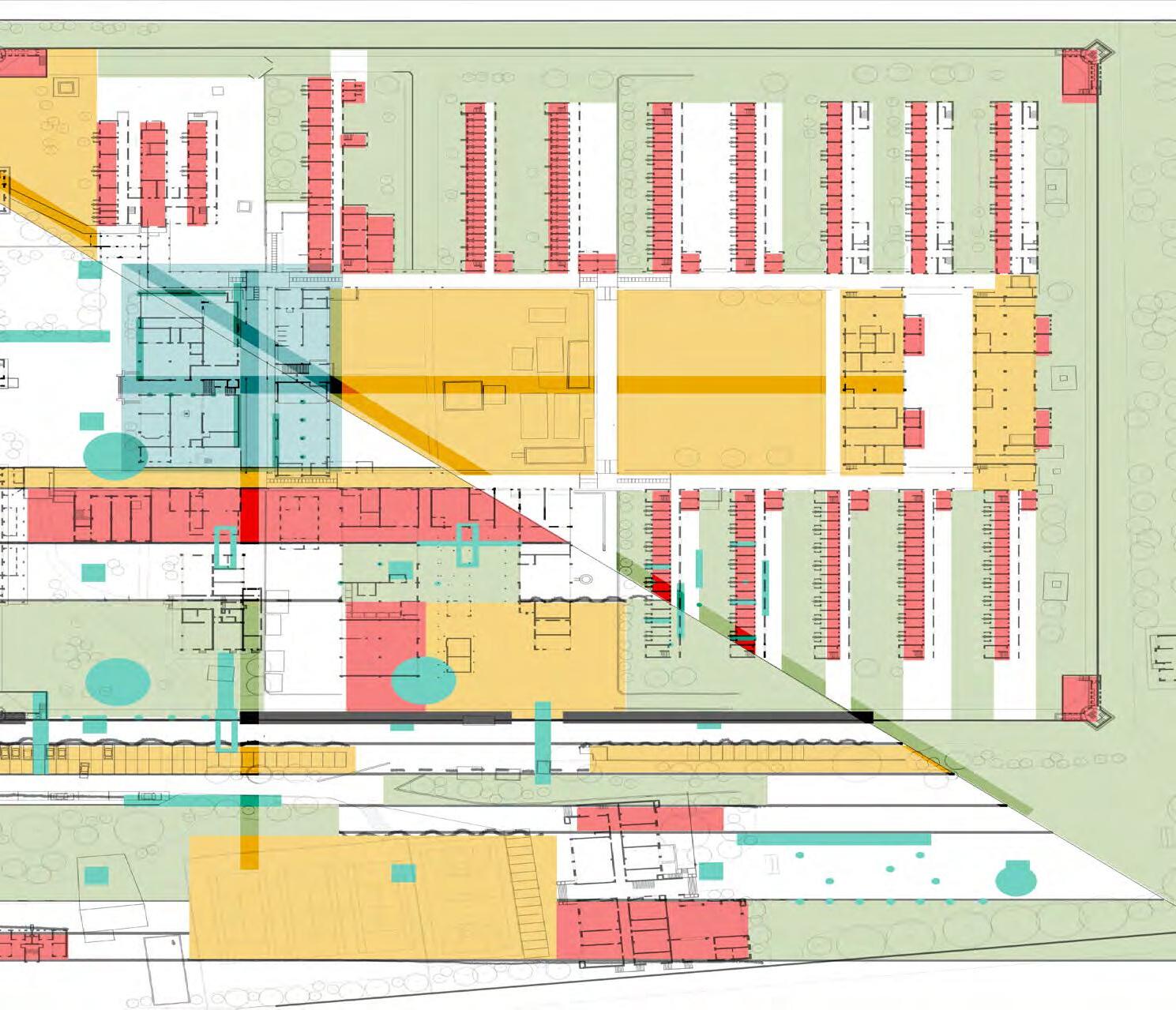 Seong-dong transition is a adaptive-reuse project to renovate prison which exists like an isolated island on a block surrounded by Ogeum Station intersection. While architecture is dependent on matter, society changes at an incomparably rapid pace. I asked how to respond to the rapidly changing demands of society under the most closed condition of a prison with layers of outer walls, main walls, and prison rooms. Elements such as existing walls and pillars of the original building are left and ETFE box which provides flexible functions. Inside the box is newly covered and follys are freely scattered and the new box absorbs the surrounding elements such as water, tree, people and a new diagonal axis.
