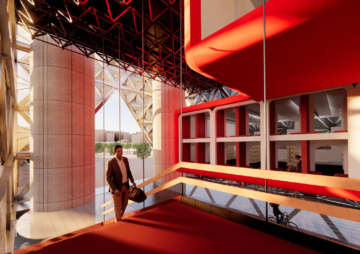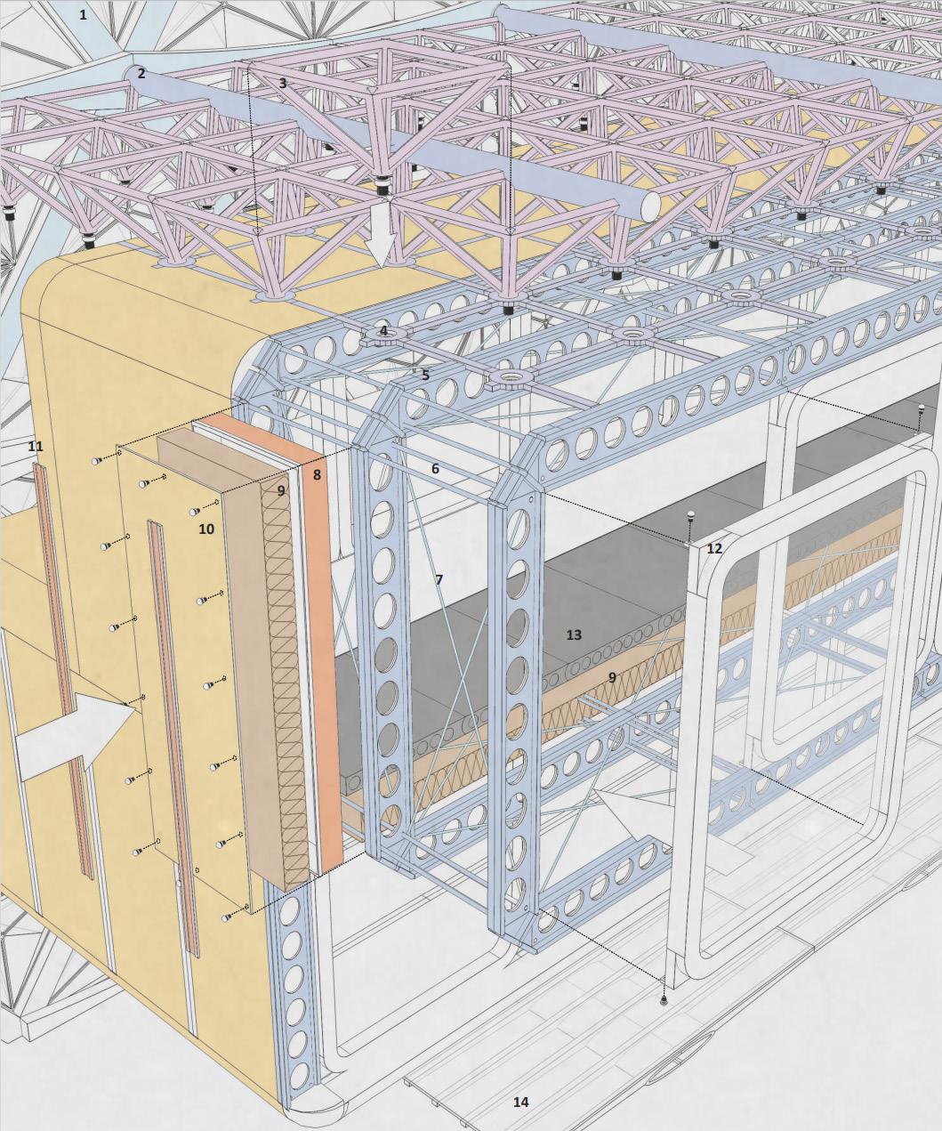 3, Tertiary structure, steel 1500mm x 1500mm space frame to span the bridge providing hard-points for suspended pods.