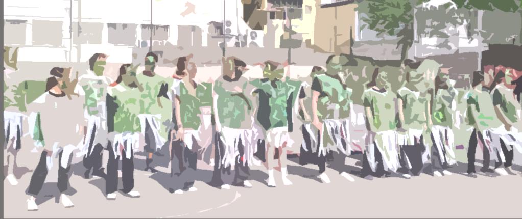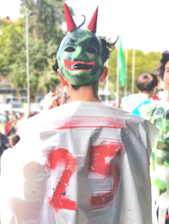 Elegemos para o “antes” um fato preto, ao qual foram adicionadas duas cruzes vermelhas, uma na frente e outra nas costas. A máscara foi pintada de preto com lágrimas vermelhas, à volta dos olhos, e uma mão da mesma cor à frente da boca. Esta imagem pretendia sugerir um padrão, em que todos eram iguais. As cruzes simbolizavam as proibições, a mão a ausência da liberdade e as lágrimas, o grande sofrimento. A escolha das cores não foi aleatória, tendo sido importante que houvesse um contraste entre o vermelho e o preto de modo a mostrar que o que se passava para fora do país contrastava com a realidade deste. Para o momento “durante” foi escolhido um fato branco com uma pintura de camuflagem a aludir os militares. Pintámos com tinta spray vermelha, o número 25 e construímos cravos, permitindo a associação com a revolução pacífica. Na máscara, utilizamos o mesmo padrão de camuflado, inspirando-nos no Careto (personagem tradicional do Carnaval português, e que simboliza a passagem do inverno para a primavera). Foram, ainda, colocados “uns cornos e lábios vermelhos” para sugerir um sorriso trocista. Este figurino pretendia transmitir os sentimentos e as experiências vividas durante a revolução: a esperança e a vontade por lutar. A turma que trabalhou o momento “após” teve o maior desafio, pois tinham a liberdade de fazer o que qui-