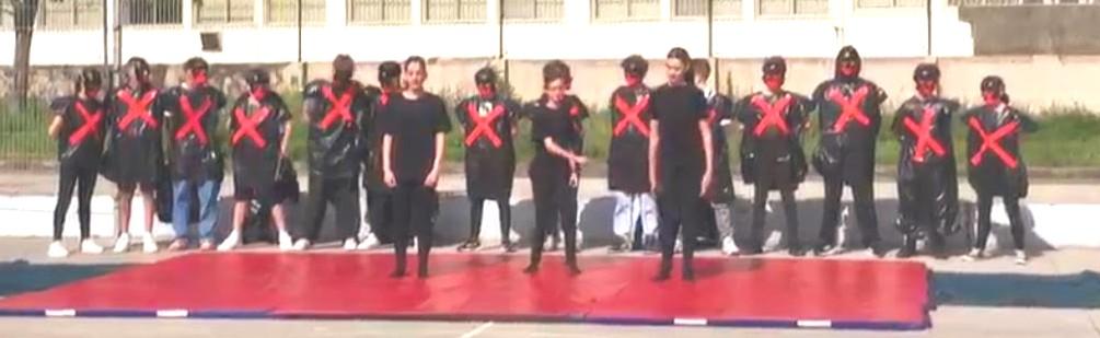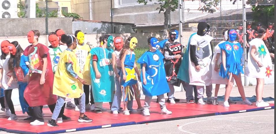 Por último, na disciplina de Educação Física, foi preparada pelos alunos uma coreografia referente a cada um dos momentos (antes, durante e após o 25 de abril), que foi apresentada, numa performance coletiva.