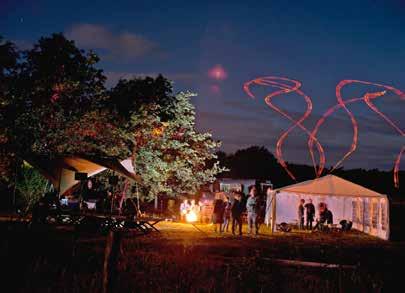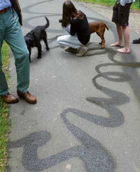 gemeinsam entlang der Grenzen von privaten Gärten und industriellen Agrarflächen zu wandern und über landwirtschaftliche Entwicklungen nachzudenken: Vom Gutsgelände aus bis hinunter zur Siedlung zieht eine Menschengruppe. Darunter sind auch die GutsbesitzerInnen, die viele Geschichten erzählen: von der Zeit, in der ihren Vorfahren noch mehr Ländereien gehörten und die ArbeiterInnen für geringe Löhne harte körperliche Arbeit leisten mussten, aber auch Geschichten aus der Gegenwart. Die Gruppe ist mit Handwagen, Gartengeräten und einer sonst für Pestizide verwendeten, jetzt mit Wasser befüllten Spritze ausgestattet, mit der ein Künstler erfundene Zeichen und Linien auf die Landstraße sprüht – ein mehrdeutiges Spiel mit uneindeutigen Markierungen. In der Siedlung angekommen werden Stühle aus den Häusern zusammengetragen, um zu plaudern und etwas zu essen. Im „Autokino“ (auf einem Laptop im Kofferraum) wird ein Film gezeigt, den eine Drohne auf einem der umliegenden Felder im Vorfeld aufgezeichnet hat: Symbolhaft ist hier zu sehen, wie ein Mähdrescher von seinen gewohnten Bahnen abweicht und eine Kreisform in das Getreide mäht – auch hier wird eine Markierung hinterlassen, die von der Norm abweicht. Zu Live-Musik mit Saxophon, Posaune, Cello, Bass und Jembee klingt der Abend aus.