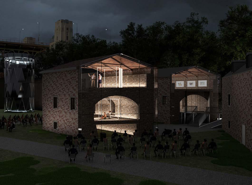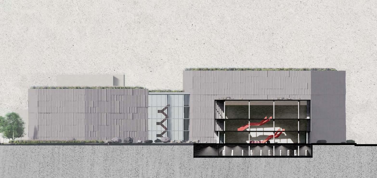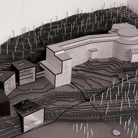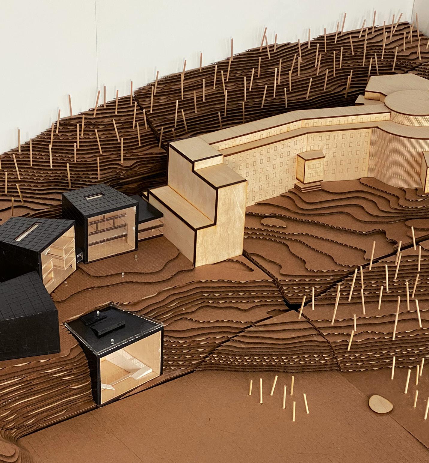 The project is inspired by the relationship between the mountain and the city, an antithesis between nature and civilization. Its placement extends from the mountain towards the city, reaching the current football field located a few steps from the future civic hub, which will soon host the REM station. This new development proposes the repurposing of this land into an arts park, providing a platform for various disciplines, with a major focus on music. Sound is, in fact, a fundamental principle in the design of the expansion. Its enhancement is crucial and is dictated by a series of expansions and compressions throughout the main circulation. These different sound experiences are made possible by the pavilion approach chosen, thus creating a multitude of atmospheres at the heart of each