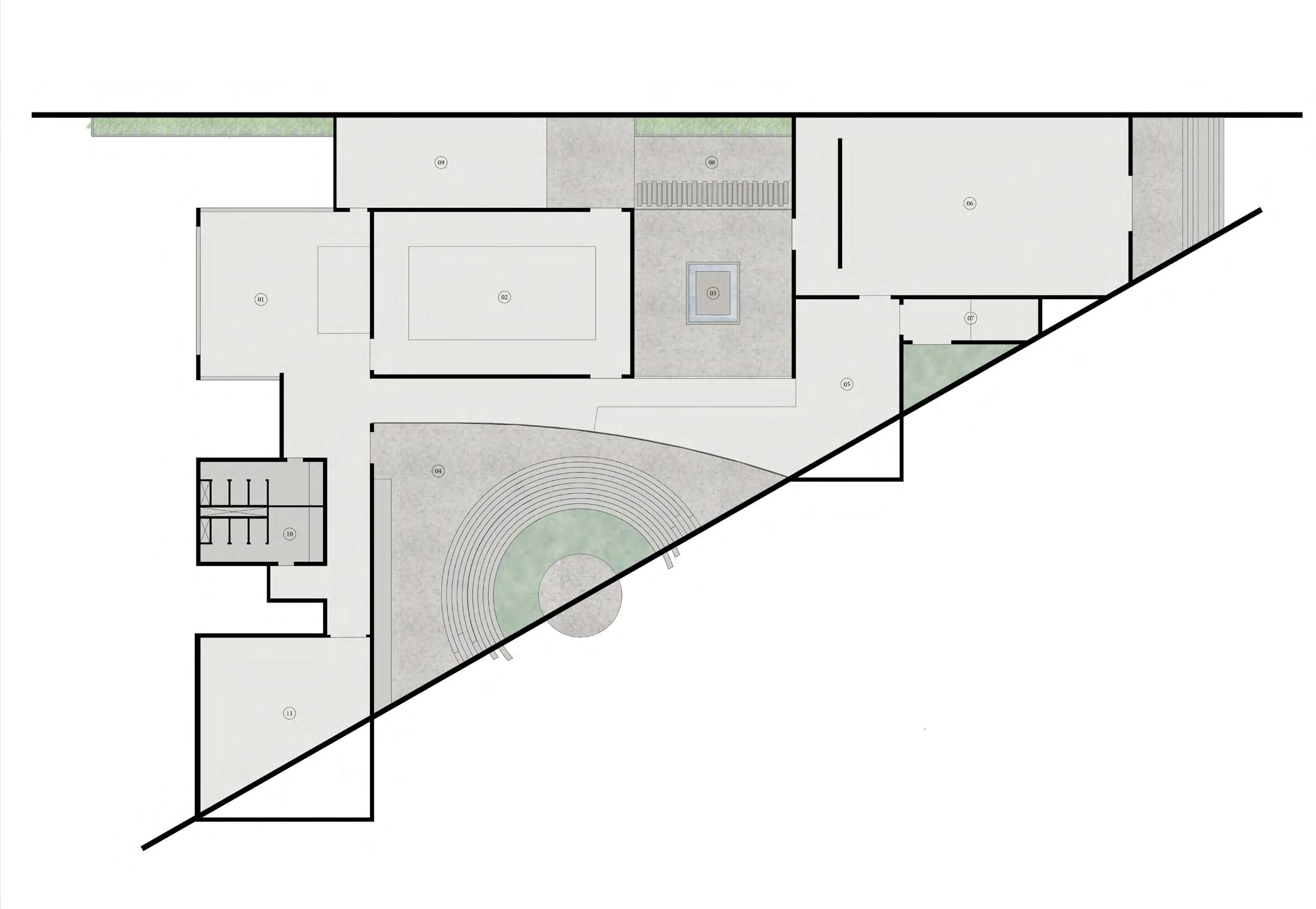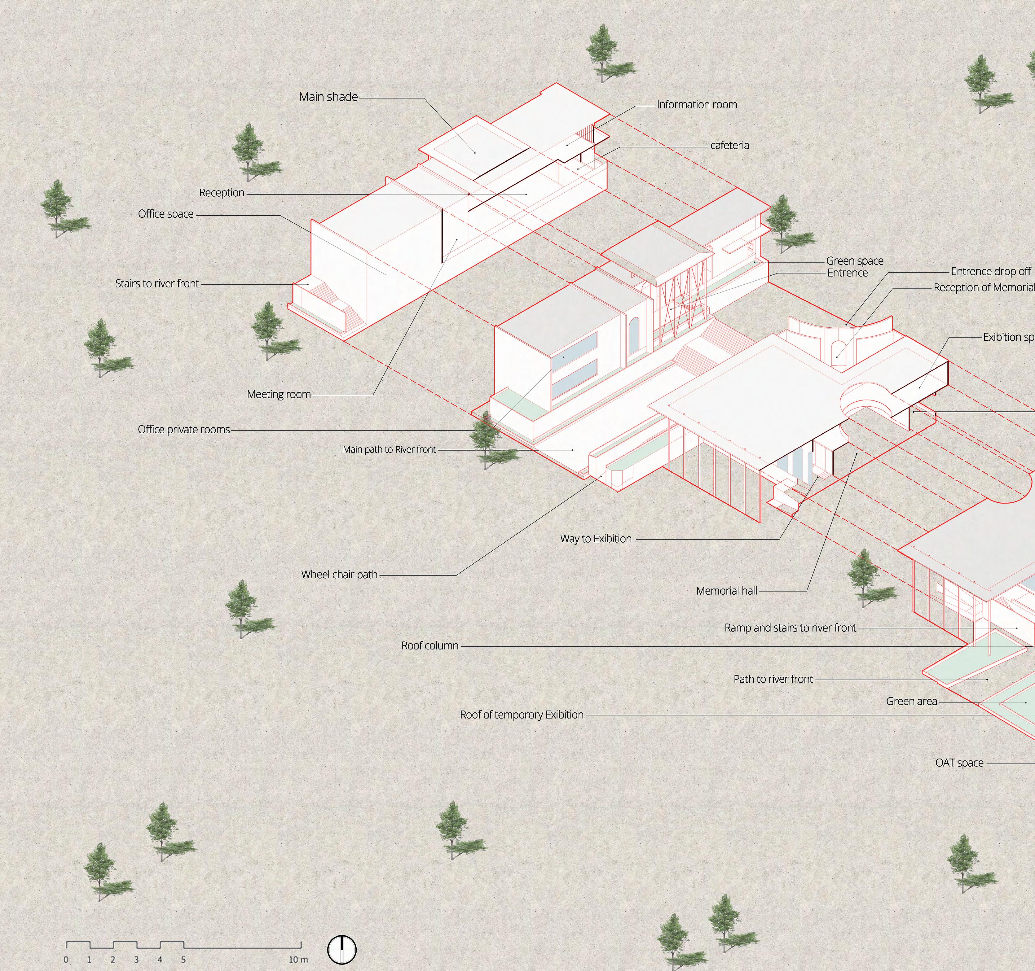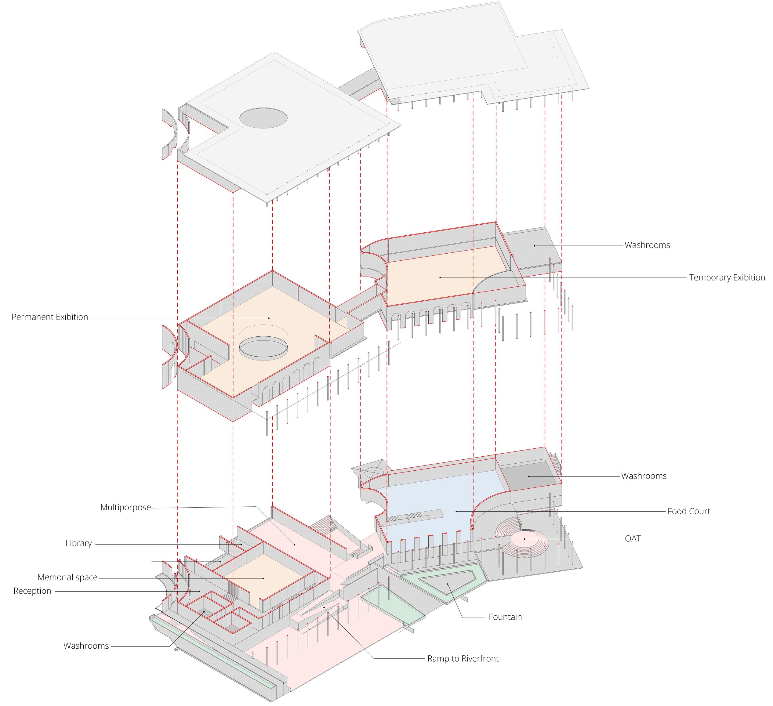 The The Memorial Complex’s exploded view reveals reception, memorial hall, library, meditation area, multipurpose hall on ground