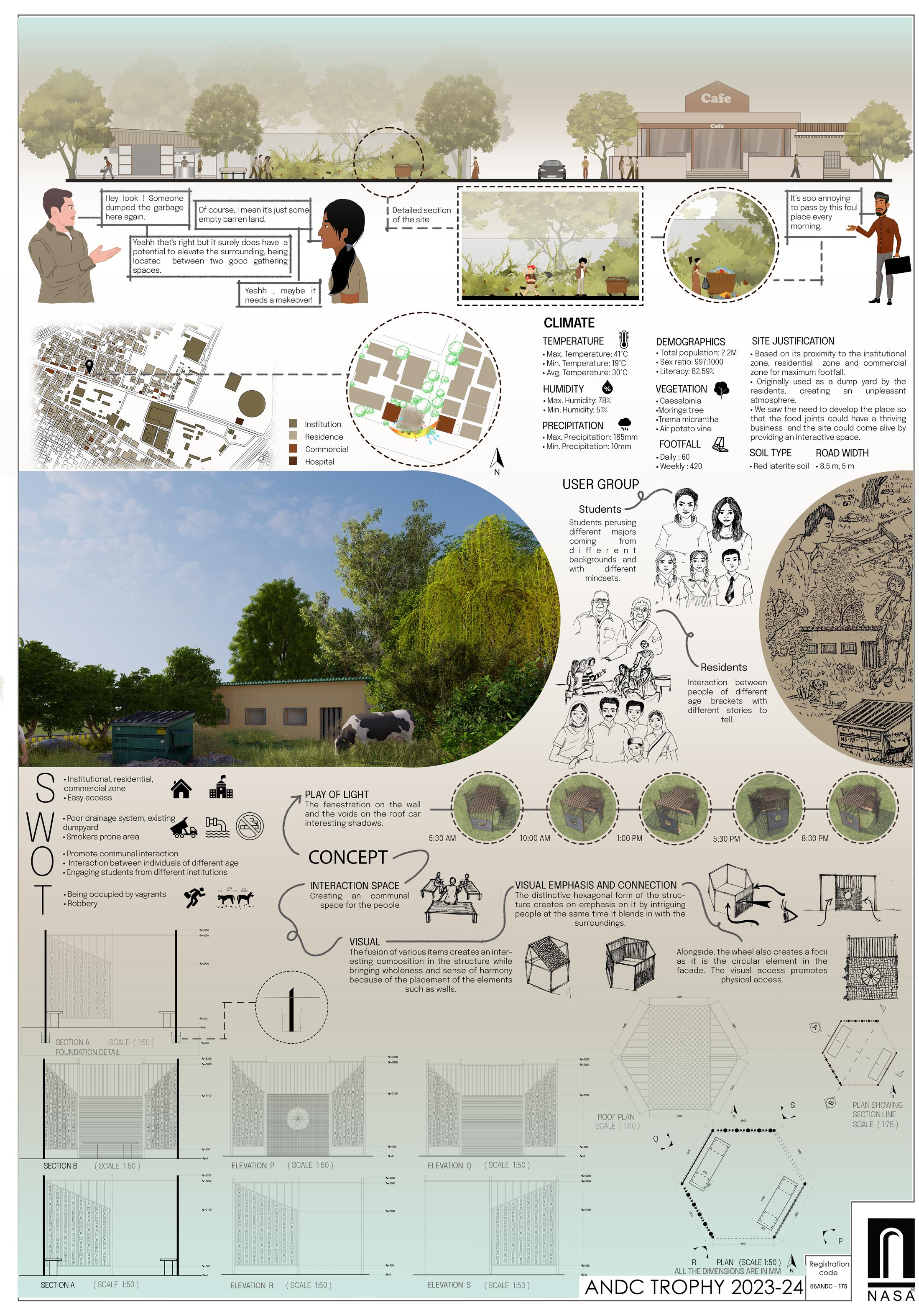The brief for the “Walk The Talk” NASA Design Competition calls for the creation of a pavilion demonstrating the potential of utilizing pre-used, discarded, or waste materials in architecture to promote sustainable building practices. Participants are tasked with designing and building a functional space that reflects the theme of “Reduce, Reuse, Recycle,” aiming to raise public awareness. Teams must meet specific program requirements, including accommodating a group of individuals, selecting an appropriate site, and adhering to structural and construction guidelines.