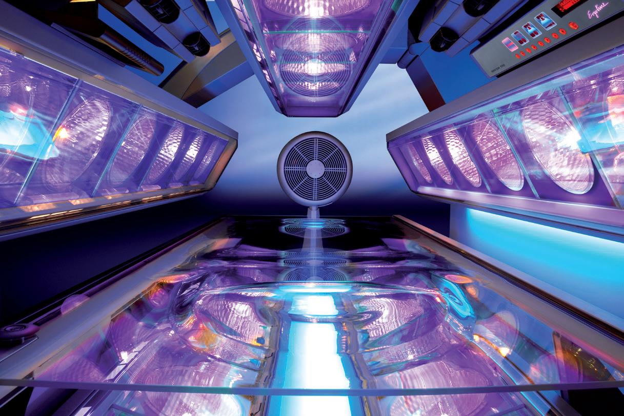 The Open Sun by Ergoline is the only unit of its kind offering 360-degree highpressure tanning in an open environment. One of Ergoline’s all-time best-selling units, the Open Sun 1050 is a proven performer and a perfect addition to your equipment mix, giving your customers beautiful bronzing results in 12 minutes or less. Featuring proprietary filter glass technology and 30 high-pressure lamps perfectly aligned along the canopy and base, this unit is truly a work of art. An open-air design and Fan Cooling Plus ensure customers’ relaxation during a session. This unit will draw customers from near and far and is a true masterpiece for any salon.