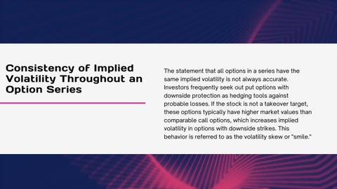 The statement that all options in a series have the same implied volatility is not always accurate. Investors frequently seek out put options with downside protection as hedging tools against probable losses. If the stock is not a takeover target, these options typically have higher market values than comparable call options, which increases implied volatility in options with downside strikes. This behavior is referred to as the volatility skew or "smile."