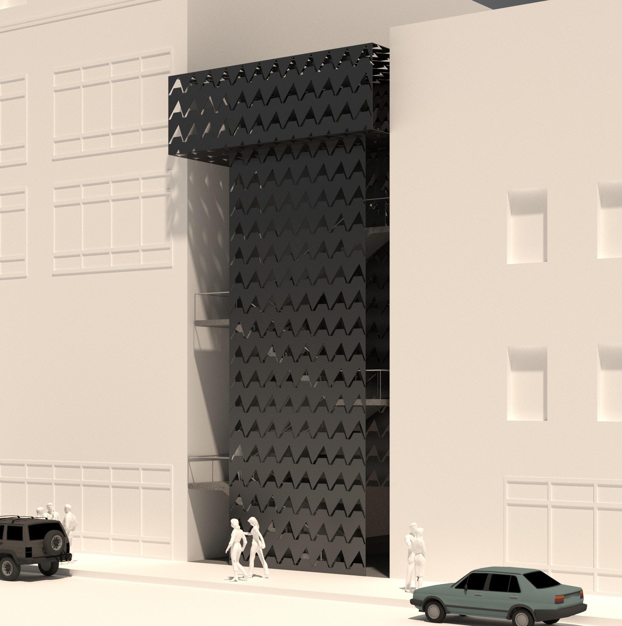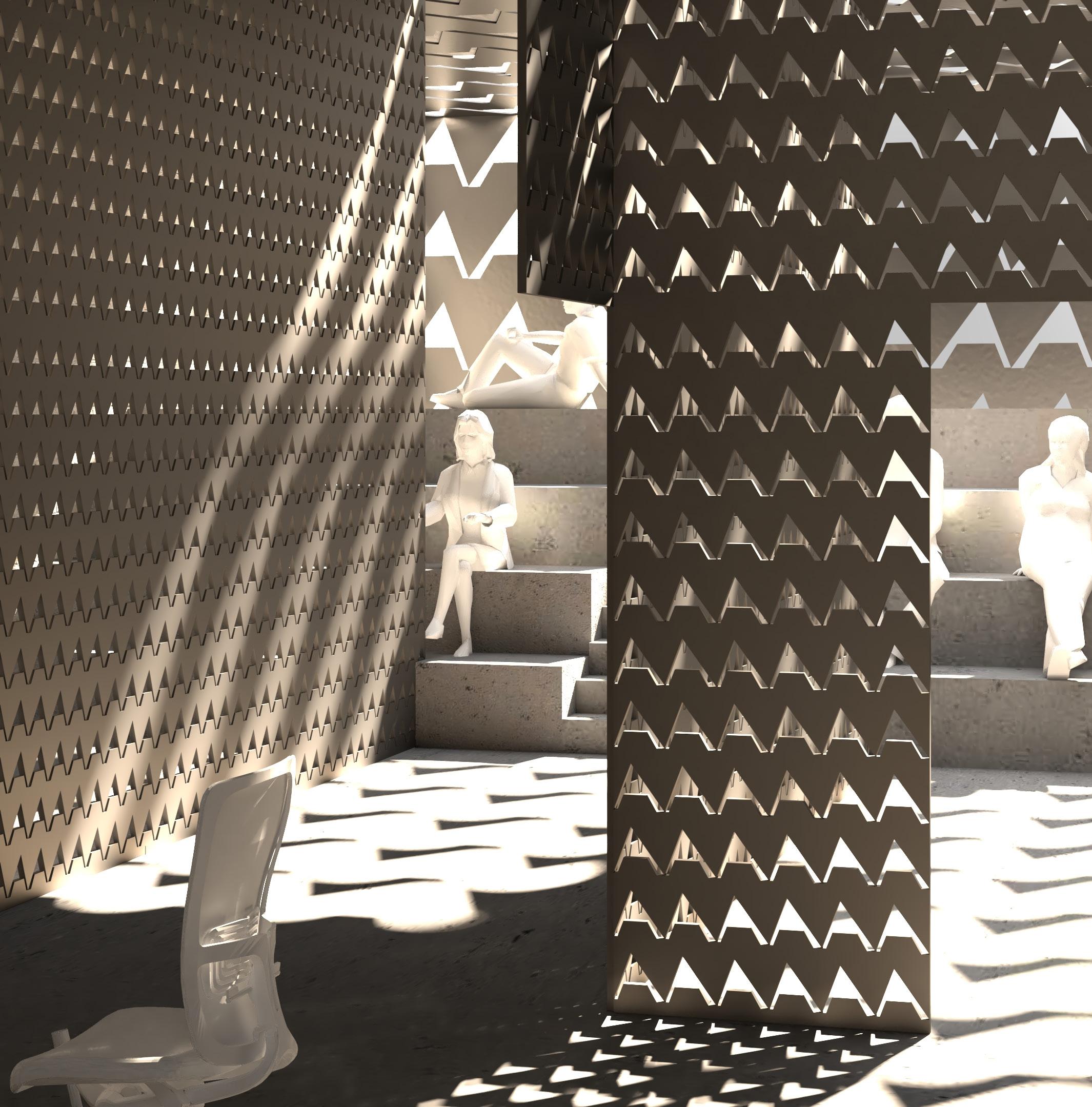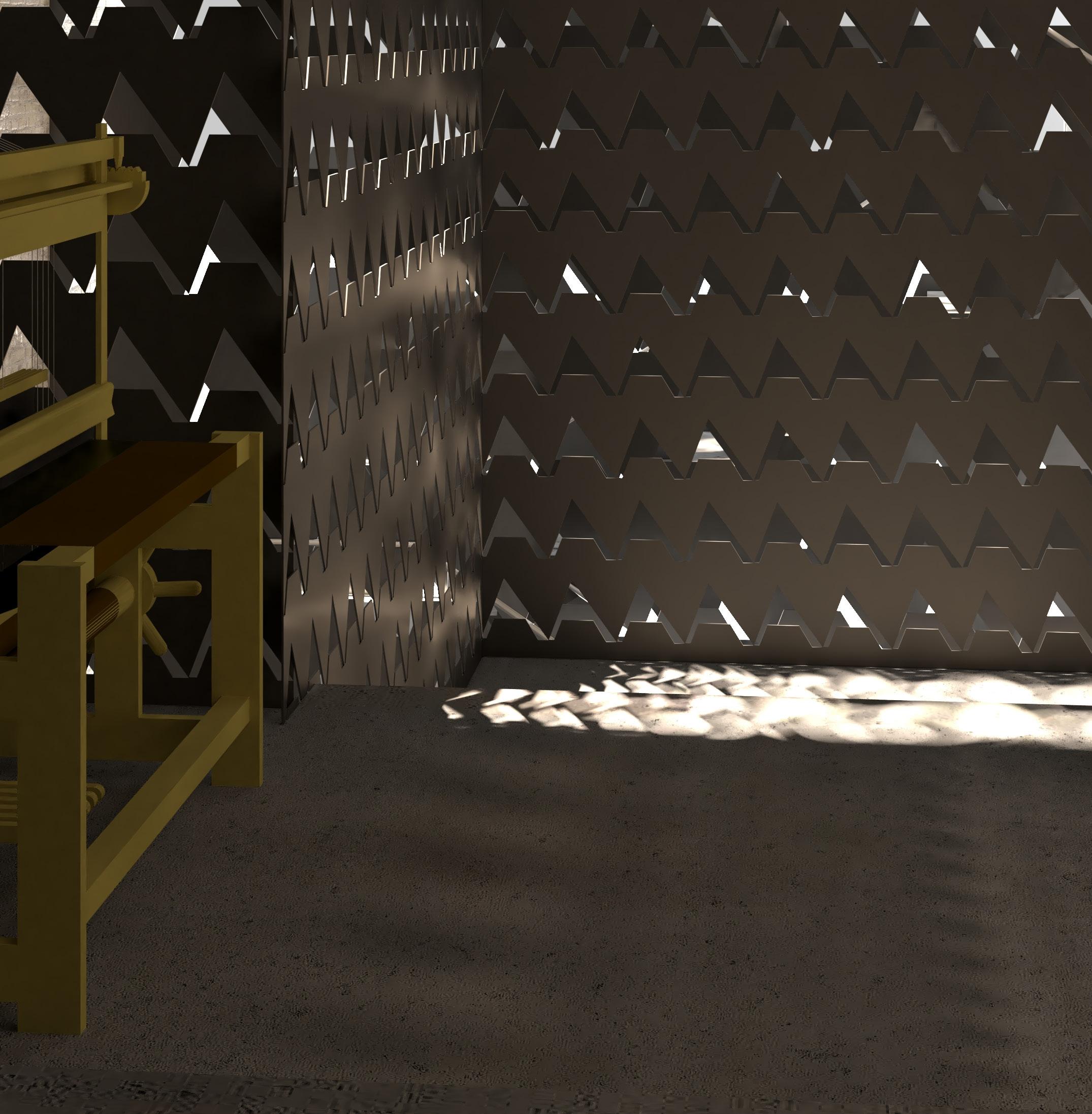 The final project for the Spring 2021 semester involved creating an art incubator in the downtown area of Syracuse. I interpolated a detail from a Loja Saarinen tapestry that I grew up looking at to create a screen with varying porosity to express the privacy of each space on the interior.