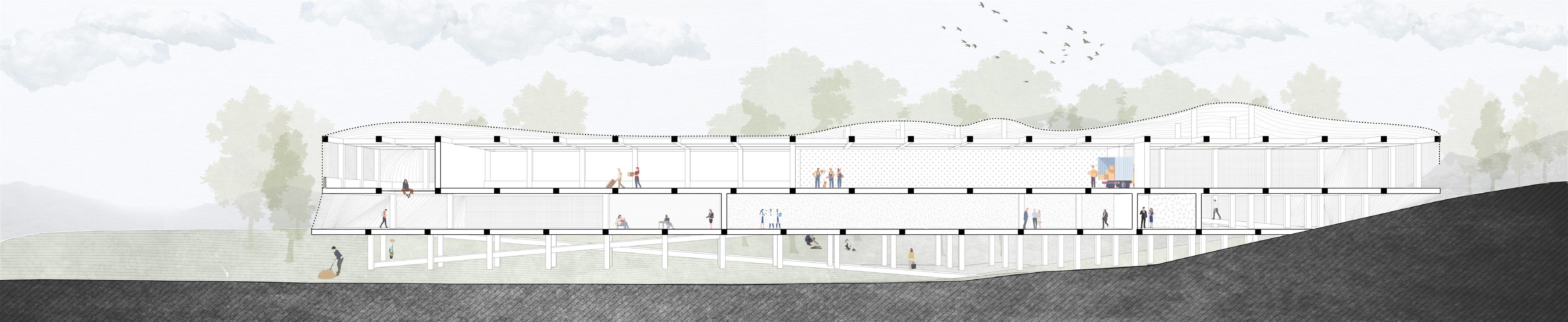 In the Spring 2022 semester we were asked to propose a farm incubator and restaurant on the Mohawk River near Schenectady, New York. Our project aimed to play with the ideas of formality and sequence; the rotated grid and the volumes formed within express the journey from farm to research to retail.