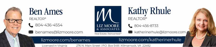 July 2023 7 Offering Decades of Experience & We Will Make It Happen! lizmoore.com/NorthernNeck 804.436.9145 | 276 N MAIN STREET | KILMARNOCK VA 22482 ONE FLAG ONE LAND ONE NATION EVERMORE! — Oliver Wendell Holmes 4thHappy of July! ONE HEART ONE HAND SANDRA HARGETT MANAGING BROKER 804-436-3454 JOE HUNT REALTOR 804-436-6020 HEIDI HOMMEL REALTOR 703-625-6335 BEN AMES REALTOR 804-436-4554 PATRICIA MEEKER REALTOR 804-436-5504 KATHY RHULE REALTOR 804-456-8733 SARA NEWSOME REALTOR 804-436-7266 49 Clifton Ave, Kilmarnock Historic Circa 1785 | Acres 127+Offered at $1,500,000 FOR SALE 2430 Bluff Point Road, Kilmarnock Waterfront Farm | Indian Creek Offered at $2,630,000 FOR SALE 1674 Fleeton Road, Reedville Circa 1918 Ideal B&B or home Offered at $425,000 FOR SALE Lots 8-9 Oyster Point, White Stone Carters Creek, 2.34 Ac±, 600±' Ft. WF Offered at $799,000 FOR SALE Sculling Oar Lane, Kilmarnock Ideal Building Lot | 2.8± Acres Offered at $89,000 FOR SALE 73 Hopewell, Kilmarnock Hills Quarter | Community Amenties Offered at $619,000 FOR SALE 115 Teal Way, Heathsville Mallard Bay/Community Pool/Docks Offered at $395,000 FOR SALE Teal Court, Heathsville Potomac River, Condit Pond 2.32 Ac± Offered at $190,000 FOR SALE