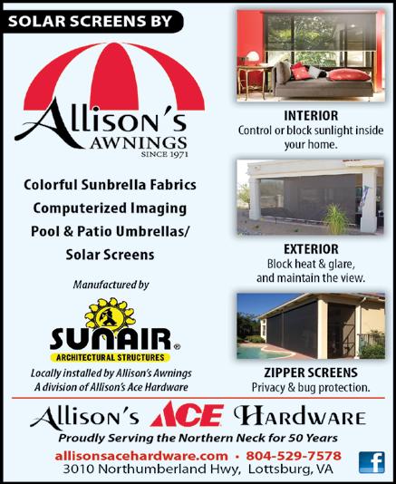 October 2023 19 Offices in the Northern Neck, Middle Peninsula, Williamsburg, Richmond, and Chesterfield. Member FDIC What does it mean when we say we go beyond banking? It means we believe a loan is more than a loan - it’s a way for a new family to turn a house into the place where a lifetime of memories will be made and shared for generations. And that’s something that goes way beyond just banking. Visit ches.bank to learn more. We go Beyond Banking because your goals go beyond banking 804-435-1126 nwpenergy.com/showroom ENTER THE LIGHT YOUR FIRE DRAWING FOR $1,000 $500 $250 Towards Any NWP Showroom Product, Service or Installation Fees. NWP has fireplace inserts and gas logs for your home. Tankless water heaters, too. Stop by the NWP Showroom at 3531 Irvington Road, Irvington, Monday through Friday, 8 to 5, and enter the Light Your Fire drawing. Go to nwpenergy.com/ showroom for drawing details and rules. Grand Prize Second Prize Third Prize 3531 Irvington Road, Irvington, Virginia 22480 POWERED BY NWP ENERGY