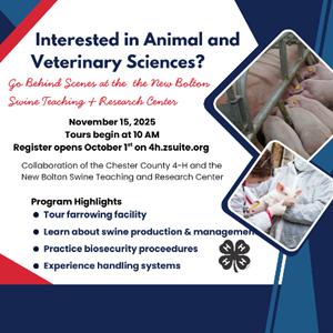 Join us for the Chester County 4-H tour of the New Bolton Swine Facility, where you'll get a firsthand look at a farrowing operation where breeding sows give birth to piglets destined for finishing farms. This immersive experience offers a unique opportunity to explore the aspects of swine production.