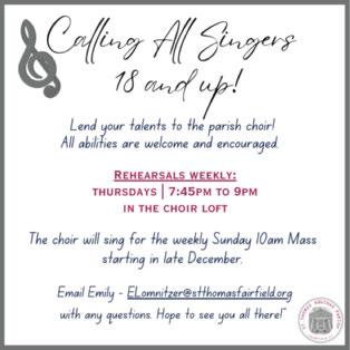 Parish Office: T:203.255.1097;E:office@stthomasfairfield.org; W:stthomasfairfield.com