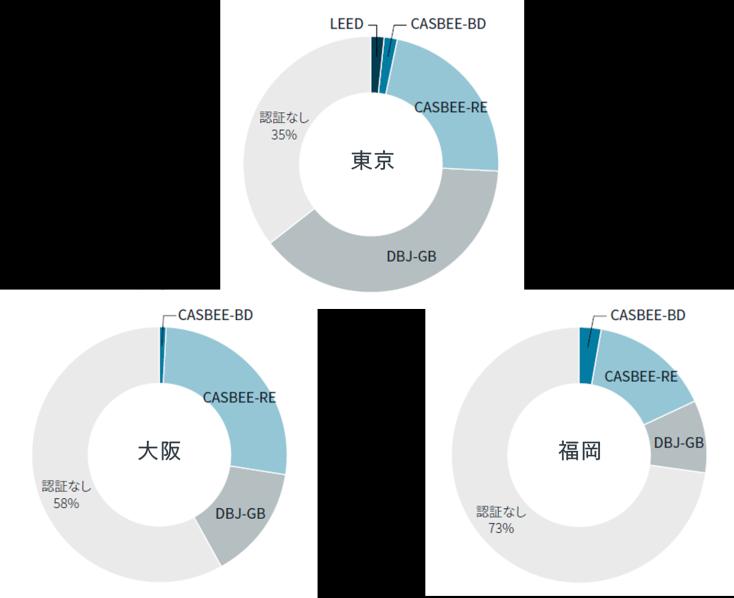 制度別の認証取得状況をみると、東京では大手デベロッパー が取得を推進するDBJ-GBの割合が最も大きく、大阪や福岡 ではCASBEE-不動産の割合が最大となっている。しかし、 JLL日本のレポート「サステナブル不動産への道:オフィス ビル編」によると、より厳格な認証制度の利用は日本全体で 依然として限られている。グローバルスタンダードである LEEDは東京で2%弱、国内認証制度で最上位ともいえる CASBEE-建築のSランクは東京で2%弱、福岡で3%である。