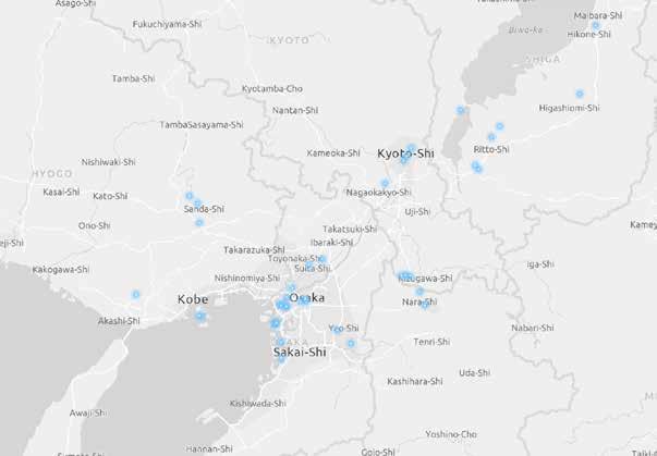 図14:近畿圏の賃貸型研究開発施設(n=43)の分布。色の濃い地域には施設が多く集まる。 ArcGIS Onlineを用いてJLLが作成