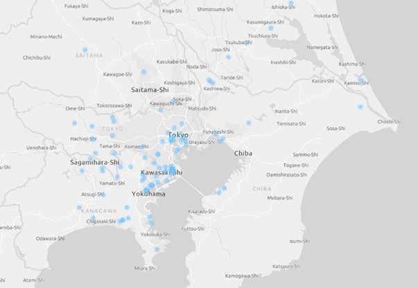図12:関東圏の賃貸型研究開発施設(n=56)の分布。色の濃い地域ほど、施設が多く集まる。 ArcGIS Onlineを用いてJLLが作成