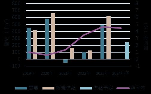 新規開発の内定率や今後の新規供 給量を鑑みて2023年第4四半期末 時点の空室率を8%超。2024年の 新規供給量は減少するため空室率 の低下を見込んでいるものの 、