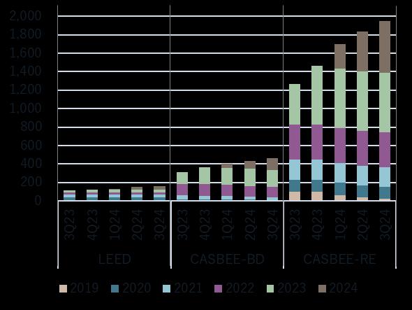 LEEDの第3四半期の認証取得件数は6件で、 2009年からの累 計件数は287件(前期比+2.1%)となった。当期にプラチナ を取得した事例はみられなかった。2024年第1-第3四半期の 取得件数は33件となり、2023年通年の30件を上回った。