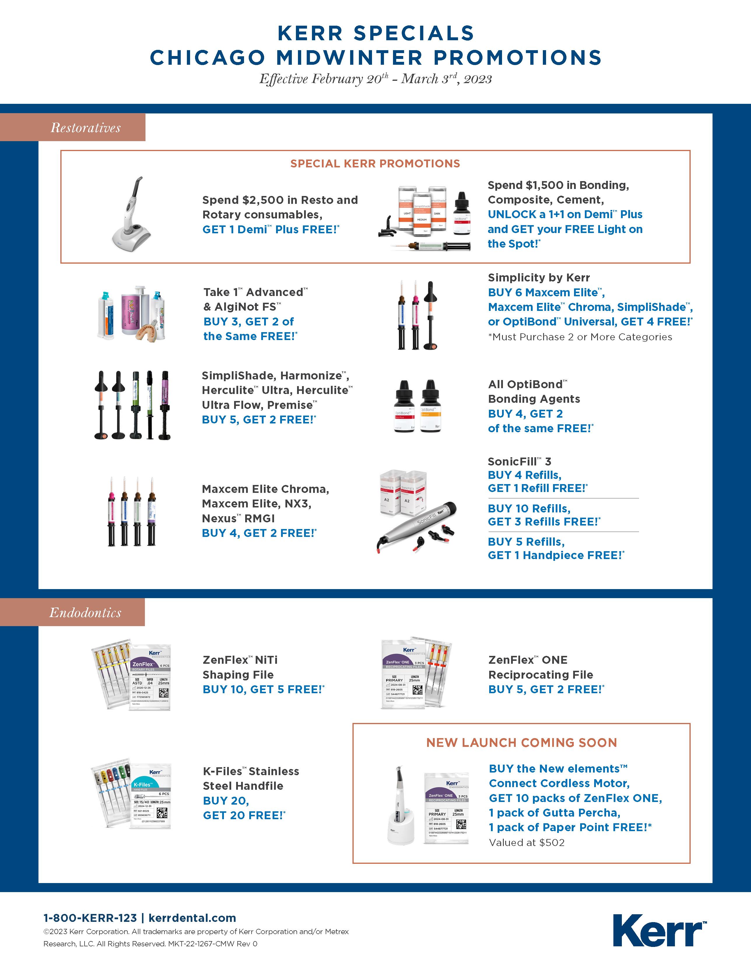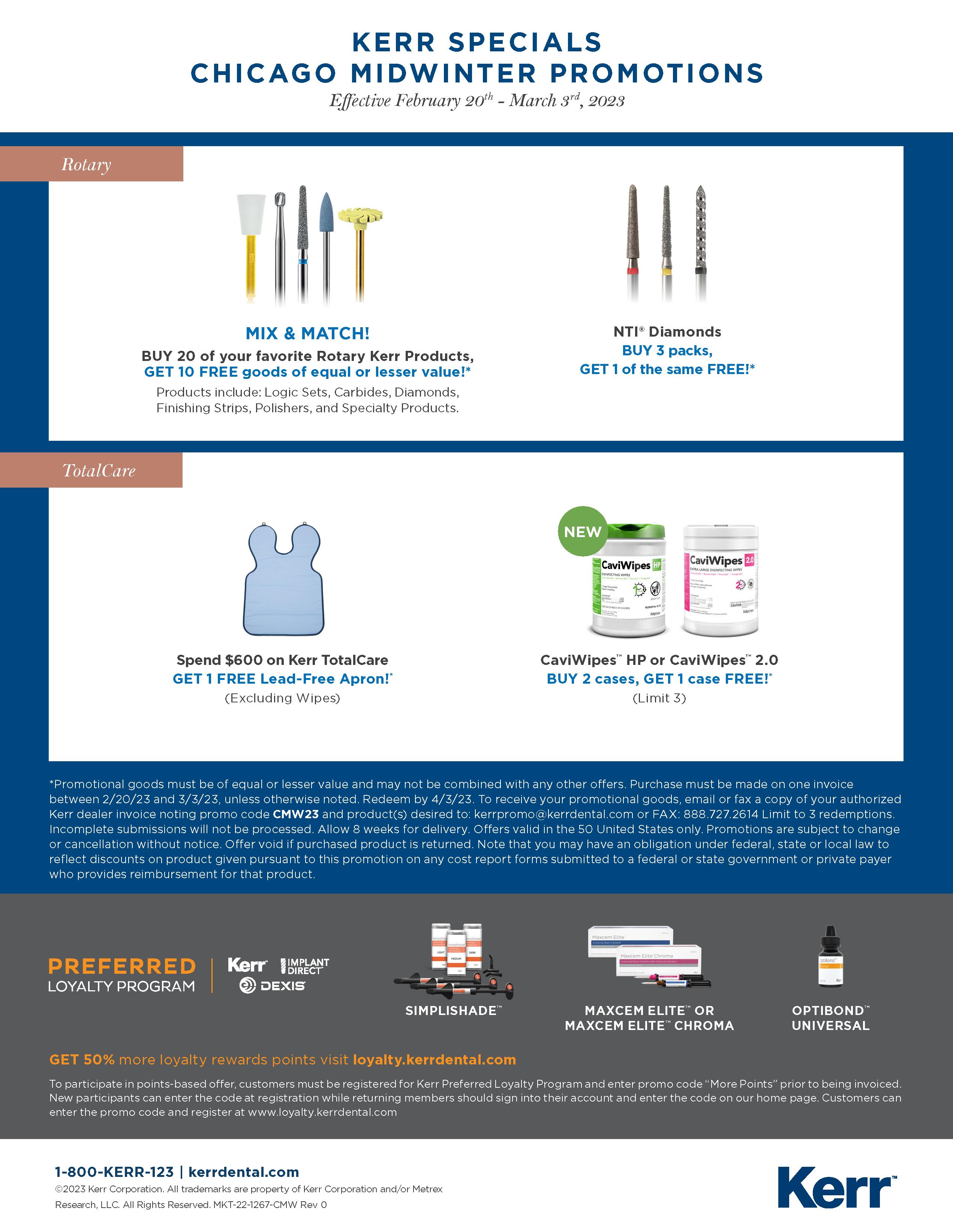 To obtain bonus goods, you can redeem by email. Proof of purchase on one 3M Authorized Distributor invoice dated February 6, 2023 – March 3, 2023 is required (multiple invoices are accepted from a single purchase order when order cannot ship complete). Redeem by April 3, 2023. Redeem by email: 3MOralCarePromos@mmm.com. Specify free product selections and include your business phone. Allow 3–5 weeks for delivery. Offers valid in the United States. Offer void if purchased product is returned. 3M, Clinpro, Filtek, Garant, Impregum, Imprint, Paradigm, Penta, Protemp, RelyX, Scotchbond and Vanish are trademarks of 3M or 3M Deutschland GmbH. © 3M 2023. All rights reserved.
