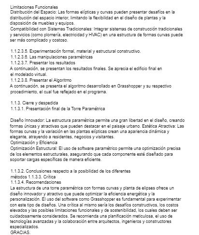 El curso de Diseño Paramétrico en la carrera de Arquitectura está diseñado para introducir a los estudiantes en el uso de herramientas digitales avanzadas que facilitan la creación y representación de diseños arquitectónicos innovadores. A lo largo del curso, los estudiantes se familiarizarán con la lógica paramétrica y la historia del diseño paramétrico, utilizando software como Rhinoceros 3D y Grasshopper para desarrollar habilidades en modelado y programación visual. Mediante la manipulación de variables y parámetros, aprenderán a generar geometrías complejas y explorar formas arquitectónicas únicas. El curso también aborda la aplicación de algoritmos y técnicas de optimización para resolver problemas de diseño, culminando en proyectos prácticos que integran las tecnologías paramétricas en contextos reales.