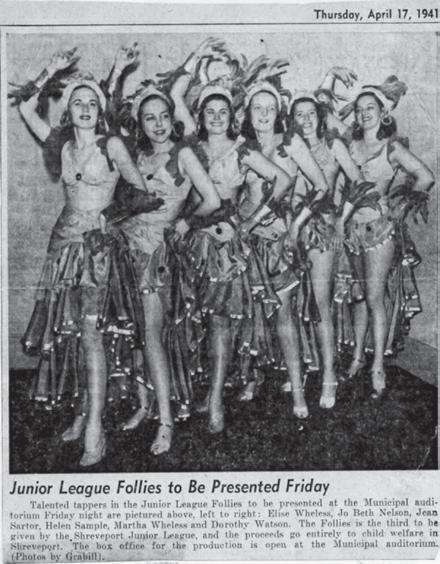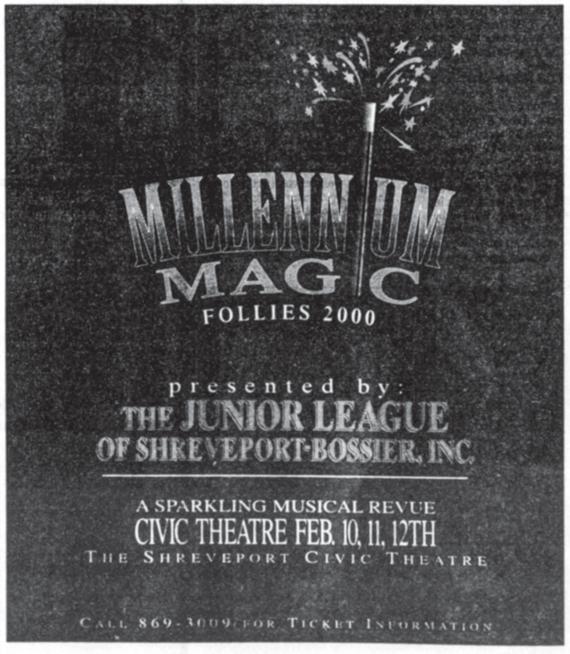 Above, left to right: The Shreveport Journal, April 13, 1941 - Conga dancers from “The Latin American Way” scene of the 1941 Follies, featuring (from left to right) Miss Ramona Spurlock, Miss Mary Virginia Willis, and Miss Frances Huey; April 17, 1941 - Elise Wheless, Jo Beth Nelson, Jean Sartor, Helen Sample, Martha Wheless, and Dorothy Watson with proceeds going entirely to child welfare in Shreveport; Ad – “Millennium Magic” The Shreveport Times, January 28, 2000