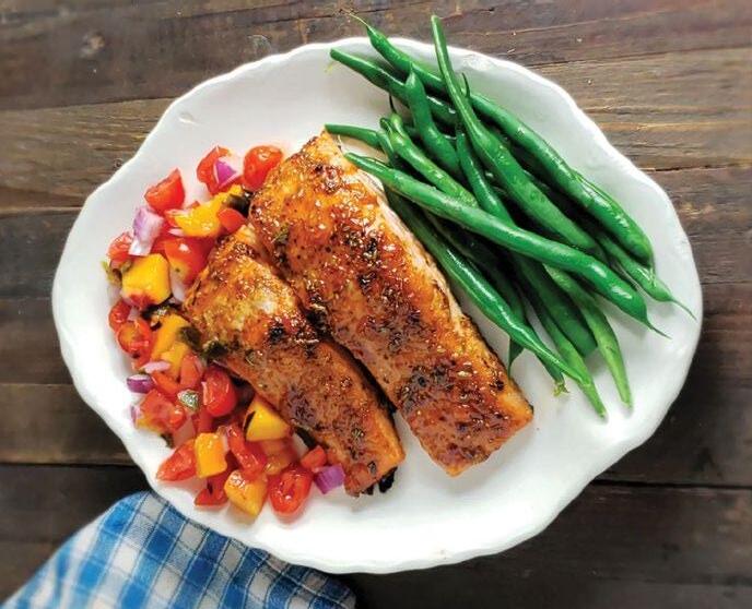 Line a broiler rack with foil and place in a broil- er pan. Arrange the fillets on the foil and sprinkle evenly with the salt. Mix the jam, soy sauce, and garlic in a bowl and spread one half of the peach mixture over the fillets.