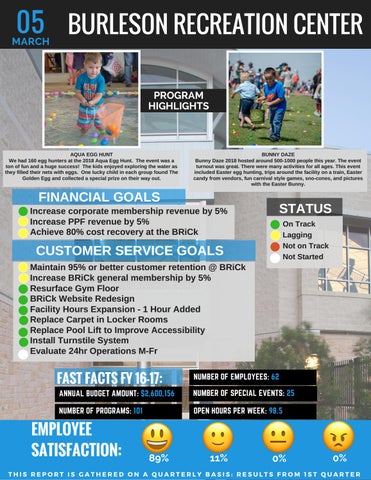 CUSTOMER SERVICE GOALS Maintain 95% or better customer retention @ BRiCk Increase BRiCk general membership by 5% Resurface Gym Floor BRiCk Website Redesign Facility Hours Expansion - 1 Hour Added Replace Carpet in Locker Rooms Replace Pool Lift to Improve Accessibility Install Turnstile System Evaluate 24hr Operations M-Fr