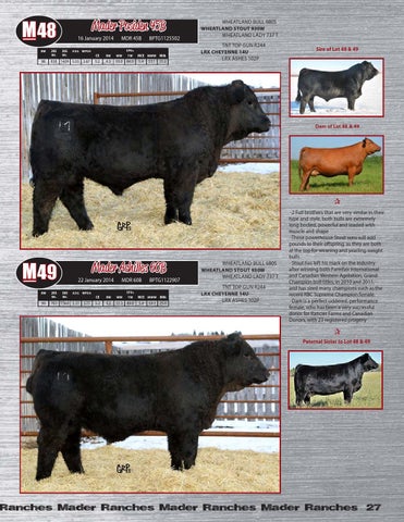 -2 Full brothers that are very similar in their type and style, both bulls are extremely long bodied, powerful and loaded with muscle and shape -These powerhouse Stout sons will add pounds to their offspring, as they are both at the top for weaning and yearling weight bulls - Stout has left his mark on the industry after winning both Farmfair International and Canadian Western Agribition, Grand Champion bull titles, in 2010 and 2011, and has sired many champions such as the recent RBC Supreme Champion female. -Dam is a perfect uddered, performance female, who has been a very successful donor for Rancier Farms and Canadian Donors, with 23 registered progeny