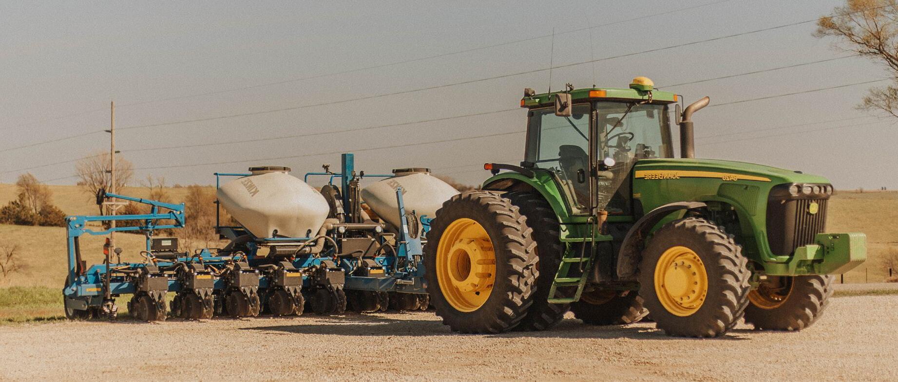A John Deere tractor keeps a steady pace whiile planting soybeans near Linn Grove.