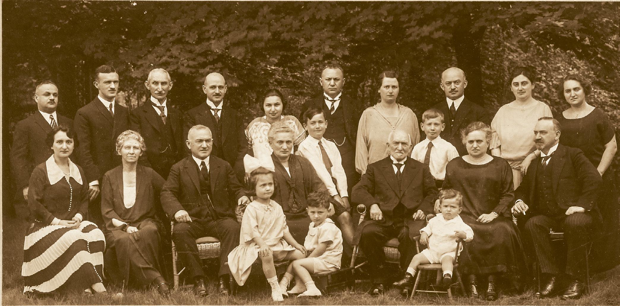 Familie Schocken am 86. Geburtstag von Isaak Schocken (zweite Reihe, Dritter von rechts). Sein Sohn Salman Schocken in der hinteren Reihe, Dritter von rechts. The Schocken family on Isaak Schocken’s 86th birthday (second row, third from the right). His son Salman Schocken is in the back row, third from the right.