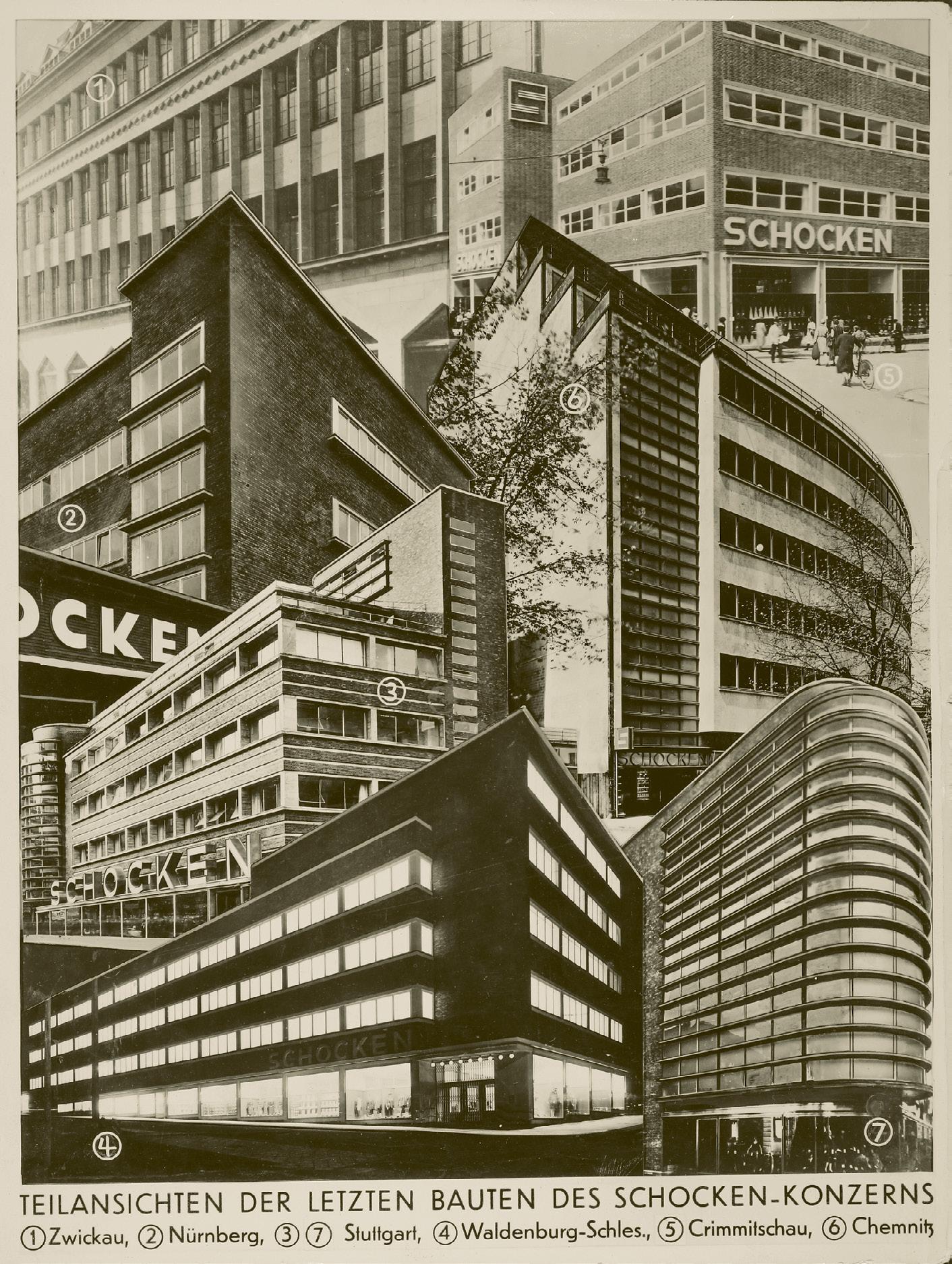 Collage mit Teilansichten verschiedener SchockenKaufhäuser, 1930er-Jahre