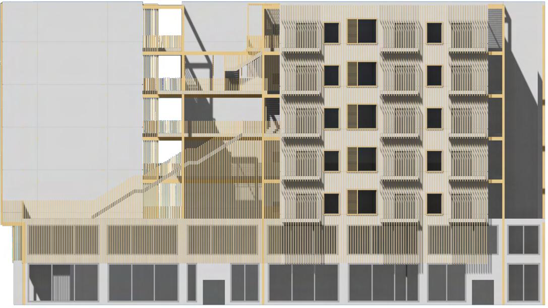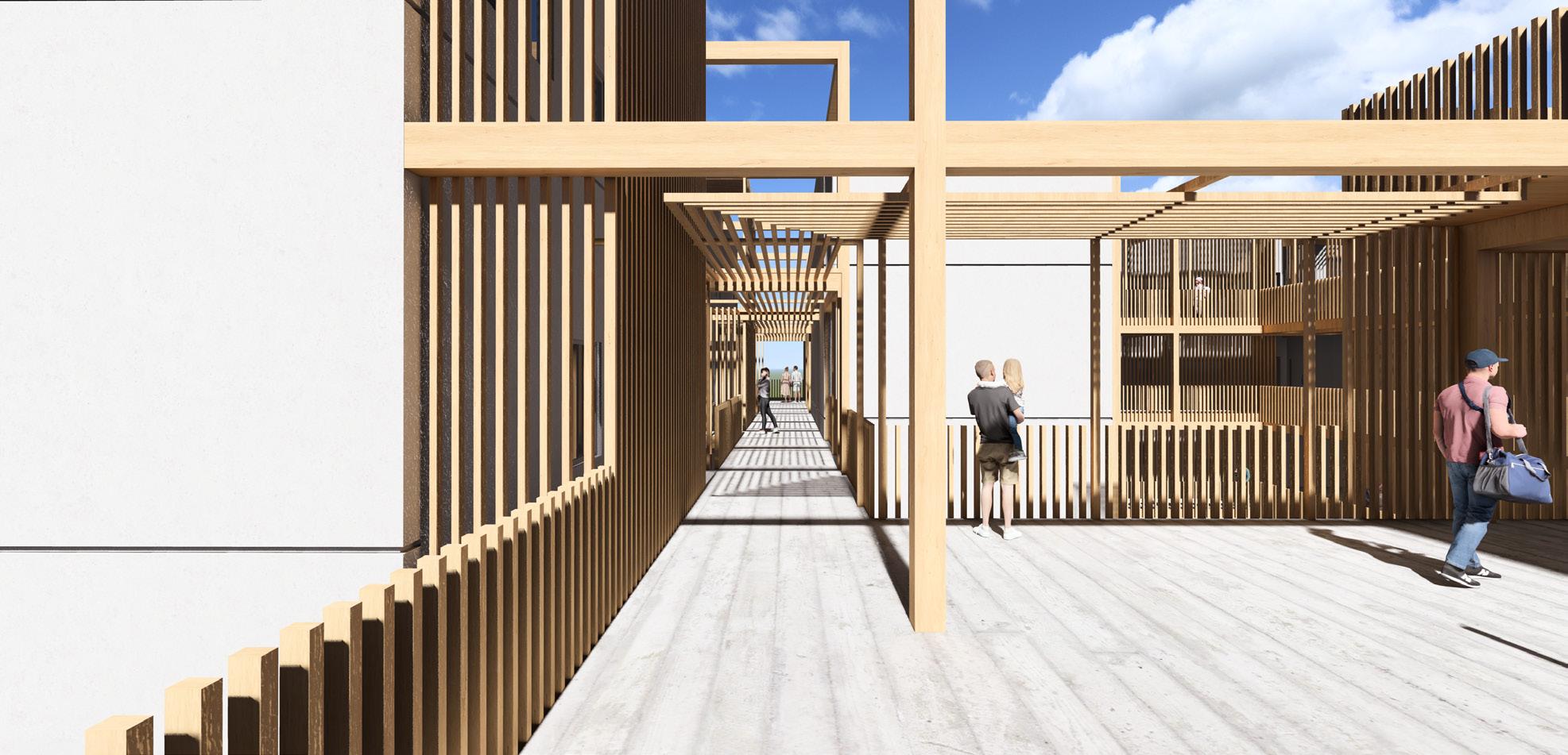 This project has distinct tower units grouped by unit types, fostering specific communities within each tower based on location and user demographics. These separate towers are linked by horizontal circulation, facilitating seamless connection between them. This horizontal circulation creates a platform for fostering meaningful social interactions and connections, presenting unique opportunities for community development. Screening conditions will be incorporated to provide solar protection, privacy, act as a sound buffer, and provide massing identification and design aesthetic.