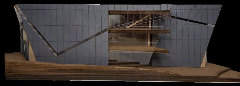Shows the relationship between the shop, silo, void, and exhibition space. This is also the first section cut in the section relief model.