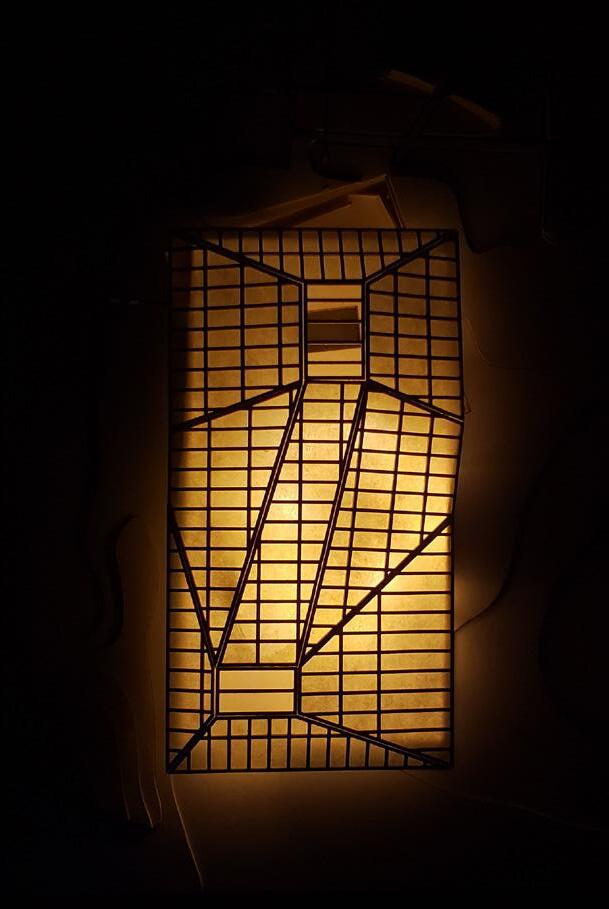 The second model is a site section model that shows the relationships between all of the built elements and the landscape. It shows the exhibition walls, the circulation paths and voids in the landscape, and the shop volume. This model was made out of matboard and shoji paper.