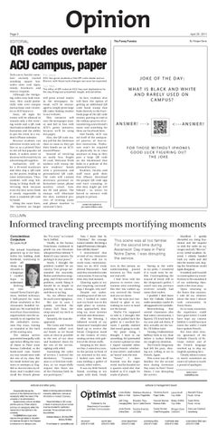 QR codes overtake ACU campus, paper Tech-sav v y faculty members recently started sneaking square barcodes onto cool signs, trendy brochures and snazzy coupons. Although the intriguing codes may look innocent, they could potentially take over campus interactions and creativity as ACU knows it. Soon, all signs for events will be allowed to contain only a few enticing words and a QR code that leads to additional information and the ability to put the event in a student’s iPhone calendar. Because students can advertise events only online or as a printed f lyer in the all-but-popular ad kiosk, it makes sense to do away with creativity in advertising all together. Authorities will allot a 10-word maximum and then slap a QR code on the poster, leading to more information. Thus, students will stop lobbying to bring chalk advertising back because even the best artist finds it nearly impossible to draw a readable QR code by hand. Along the same lines, The Optimist no longer