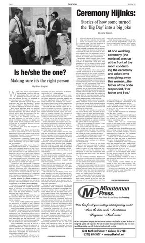 lationship you have, whether it be healthy, conflictual, etc.,” Halstead said. If a couple is uneasy with going to counseling sources to discover the answers to the many questions involving whether or not their significant other is right for them, other resources are available. For instance, the Prepare/Enrich test can be found in an online format at www.Prepare-Enrich.com. The Web site has various topics and resources available to visitors. Training sessions, programs and a variety of books that explore different marital topics are accessible to couples looking for “premarital preparation and marriage enrichment,” according to www.Prepare-enrich.com. The Web site is run by Life Innovations Inc., and was created by Dr. David Olsen. Some individuals and couples may ponder whether premarital counseling is necessary or essential to the process of discovering whether or not marriage is the next logical step, or even if the two individuals are truly right for each other. “We encourage that couples seek our help and use preventative counseling methods before marriage to better learn about one another, discover and strengthen the bond of the relationship,” Halstead said. By using such counseling methods and resources, a couple can open up about their inner feelings and discover how compatible they truly are. Using such methods to discover if the significant other is the right person to marry also can illuminate the various strengths and weaknesses found in a relationship. “Our parents and minister both pushed the idea of premarital counseling and programs to help us grow together within our relationship,” said Derrick Lott, former Hardin-Simmons University student who now lives in Dallas. Lott and his fiancé Nicole both took the Prepare/Enrich assessment test after discussing premarital counseling with their minister, Pastor Rick Daniels, who plans to marry them in the fall. “We took the test and didn’t get the best result possible, but also not the worst category available,” Lott said. “The test showed our strengths and weaknesses weren’t always the same, but it gave us something to look at and take with us to improve our relationship and make it stronger in the areas that were vulnerable.” Taking the assessment test and having discussions with premarital counselors proved positive in helping Lott and his fiancé answer whether they were right for each other. While the test did give some negative feedback about their relationship, that feedback presented ways to better improve and strengthen their relationship. Taking premarital counseling and tests can help answer whether or not you are marrying the right person and provide ways for a couple to improve and enhance their relationship. It also can prepare the couple for a strong and enriched marriage. “Premarital counseling is a great tool to help individuals and couples create a strong bond that will last through trying situations,” Halstead said. “Those who do six to eight sessions of premarital counseling with a trained therapist tend to have a higher marital success rate.” Premarital counseling is not just about discovering whether or not the choice to marry your significant other is right, but also how to make the marriage function properly, efficiently and endure, for better or worse.