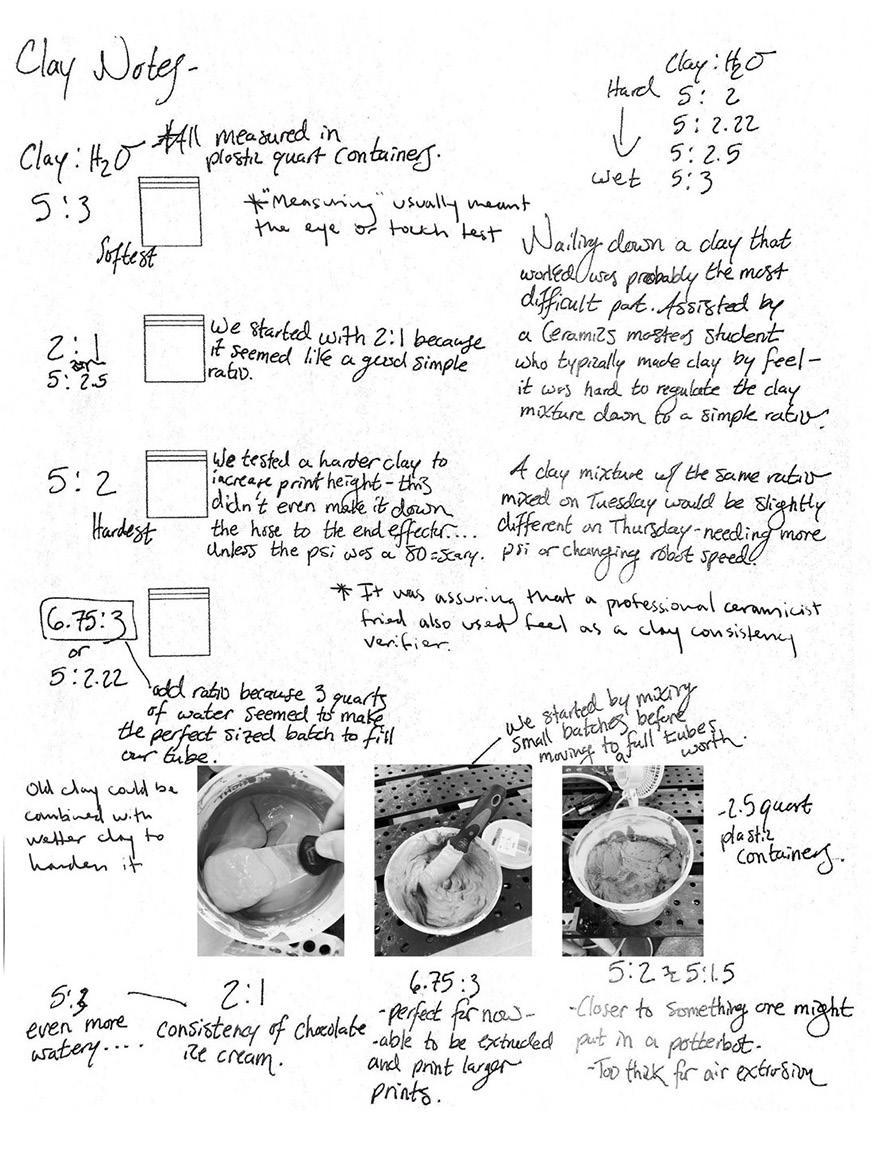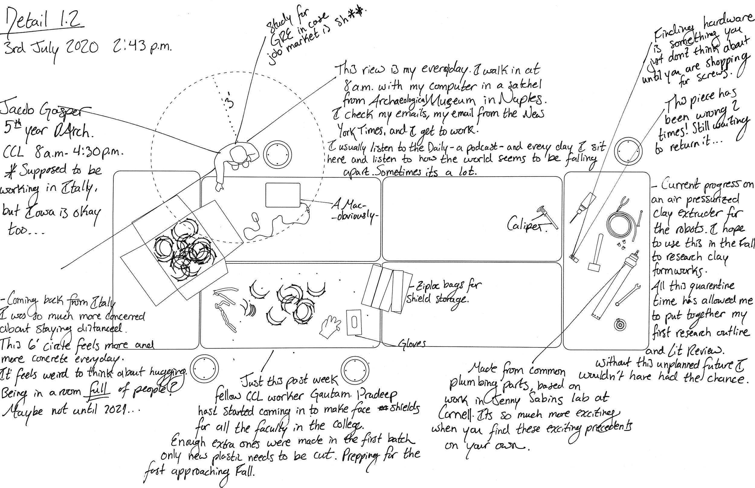 The collaborative work at the heart of the CCL was fundamentally altered by social distancing and masking. The KUKA robotic arms sat frozen in the position they were left in on March 12, 2020, the last day of in person class on. Zoom had became a verb. Clay prepared for the Potterbots sat dry in five-gallon buckets. Dust collected on the CNCs. The following drawings are artifacts of this moment in time, accompanied with text, drawings, and notes. These field notes reveal the culture and practice of computational design relies not on equipment but rather on the people who animate spaces and work with these tools.” (Gasper & King, 2020, pp 250 - 253).
