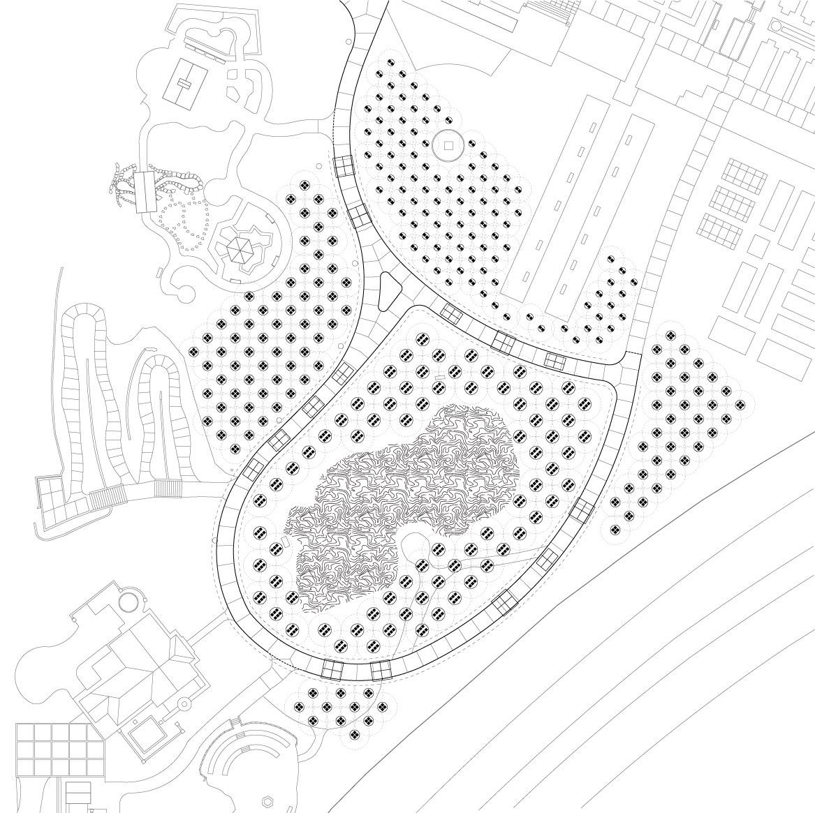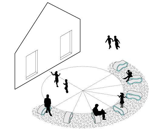 + 2.9 (top, left) rudd public library; site axonometric + 2.10 (top, right) interactive follies activating public space; axonometric + 2.11 (bottom) seven follies; elevation