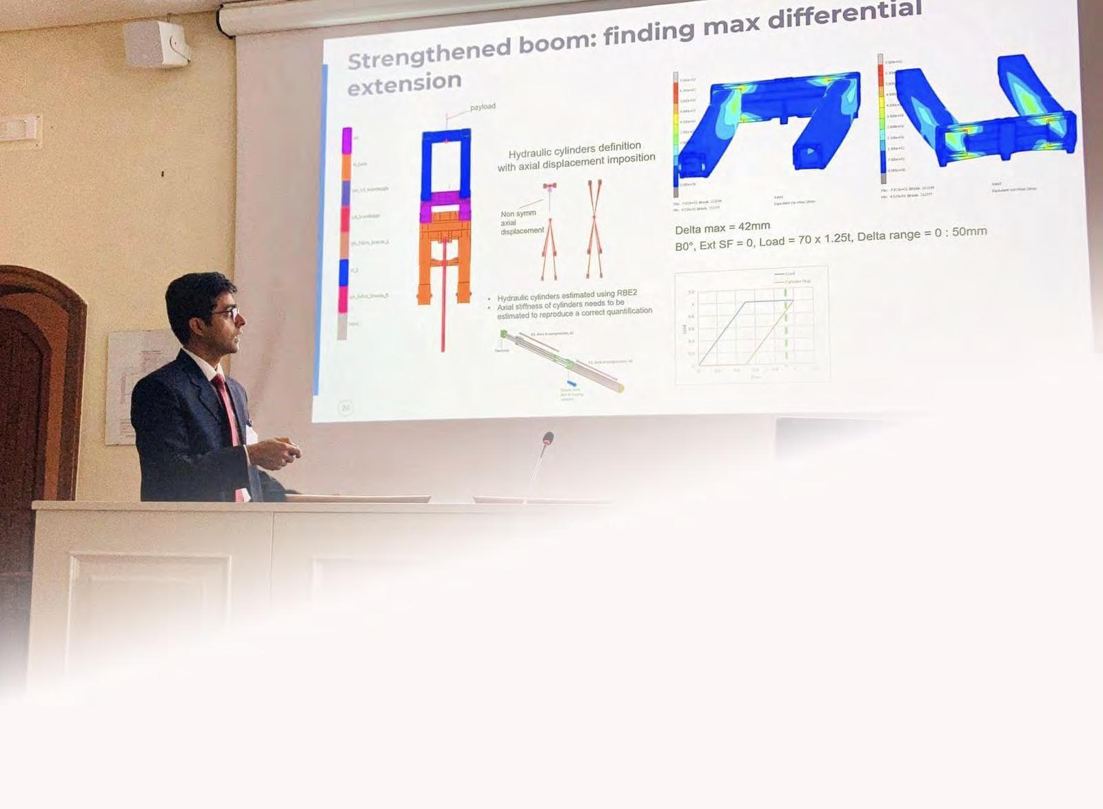 & High-Performance Computing; Modelling & Simulation of Materials & Manufacturing Processes; Analysis of Electromagnetic, Thermodynamic & Heat Transmission Processes; Model-Based Systems Engineering (MBSE); Particle-based and Meshless Methods. Against this background, Narayan’s talk illustrated several innovative case studies as well as many practical solutions developed by JMG including by means of structural simulations. This was an opportunity to share valuable insights and recommendations on how to use simulations in such a unique field as lifting.